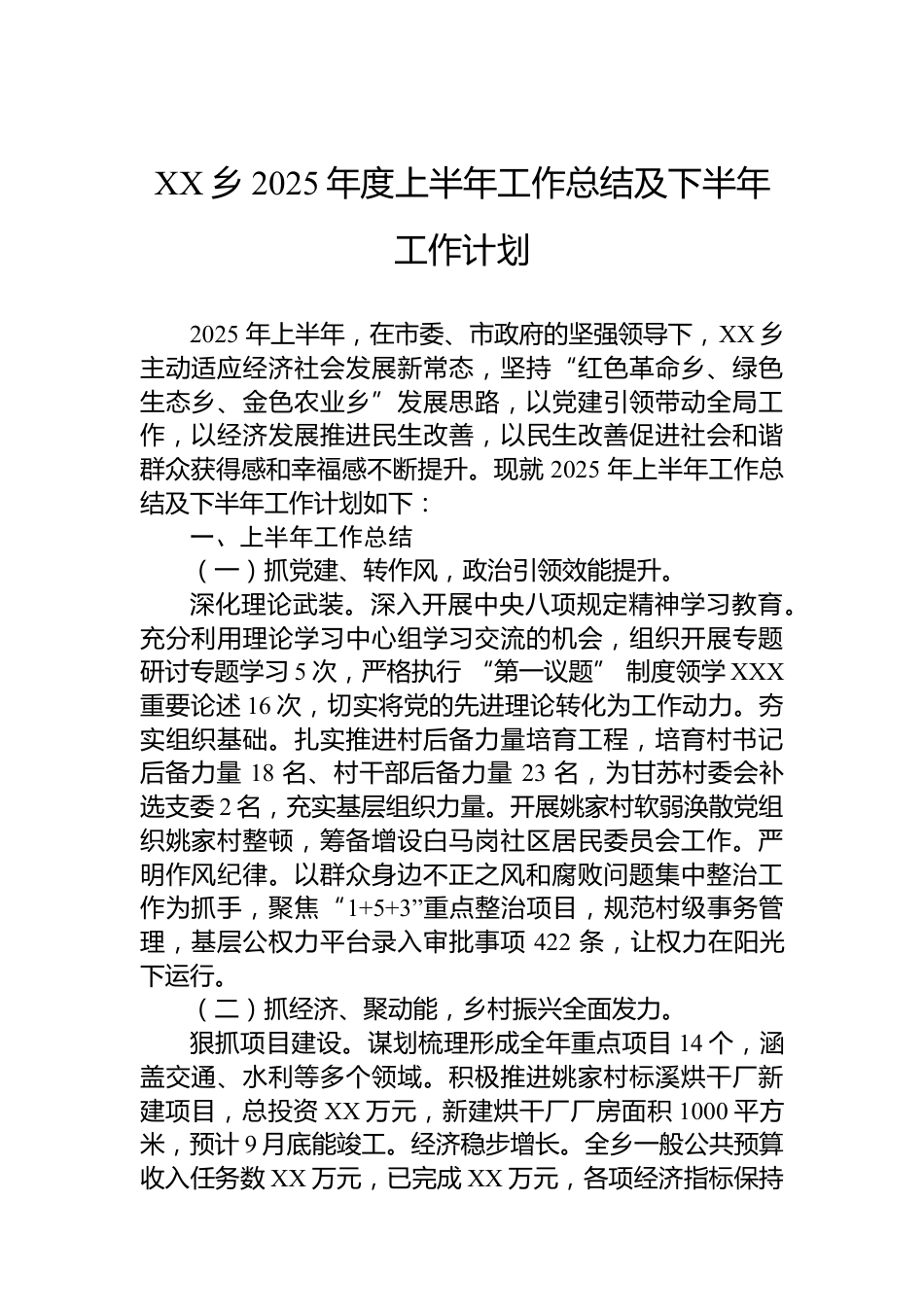 XX鄉(xiāng)2025年度上半年工作總結(jié)及下半年工作計(jì)劃2025年上半年,在市委、市政府的堅(jiān)強(qiáng)領(lǐng)導(dǎo)下,XX鄉(xiāng)主動(dòng)適應(yīng)經(jīng)濟(jì)社會(huì)發(fā)展新常態(tài),堅(jiān)持“紅色革命鄉(xiāng)、綠色生態(tài)鄉(xiāng)、金色農(nóng)業(yè)鄉(xiāng)”發(fā)展思路,以黨建引領(lǐng)帶動(dòng)全局工作,以經(jīng)濟(jì)發(fā)展推進(jìn)民生改善,以民生改善促進(jìn)社會(huì)和諧群眾獲得感和幸福感不斷提升?,F(xiàn)就2025年上半年工作總結(jié)及下半年工作計(jì)劃如下:一、上半年工作總結(jié)(一)抓黨建、轉(zhuǎn)作風(fēng),政治引領(lǐng)效能提升。深化理論武裝。深入開(kāi)展中央八項(xiàng)規(guī)定精神學(xué)習(xí)教育。充分利用理論學(xué)習(xí)中心組學(xué)習(xí)交流的機(jī)會(huì),組織開(kāi)展專(zhuān)題研討專(zhuān)題學(xué)習(xí)5次,嚴(yán)格執(zhí)行“第一議題”制度領(lǐng)學(xué)XXX重要論述16次,...