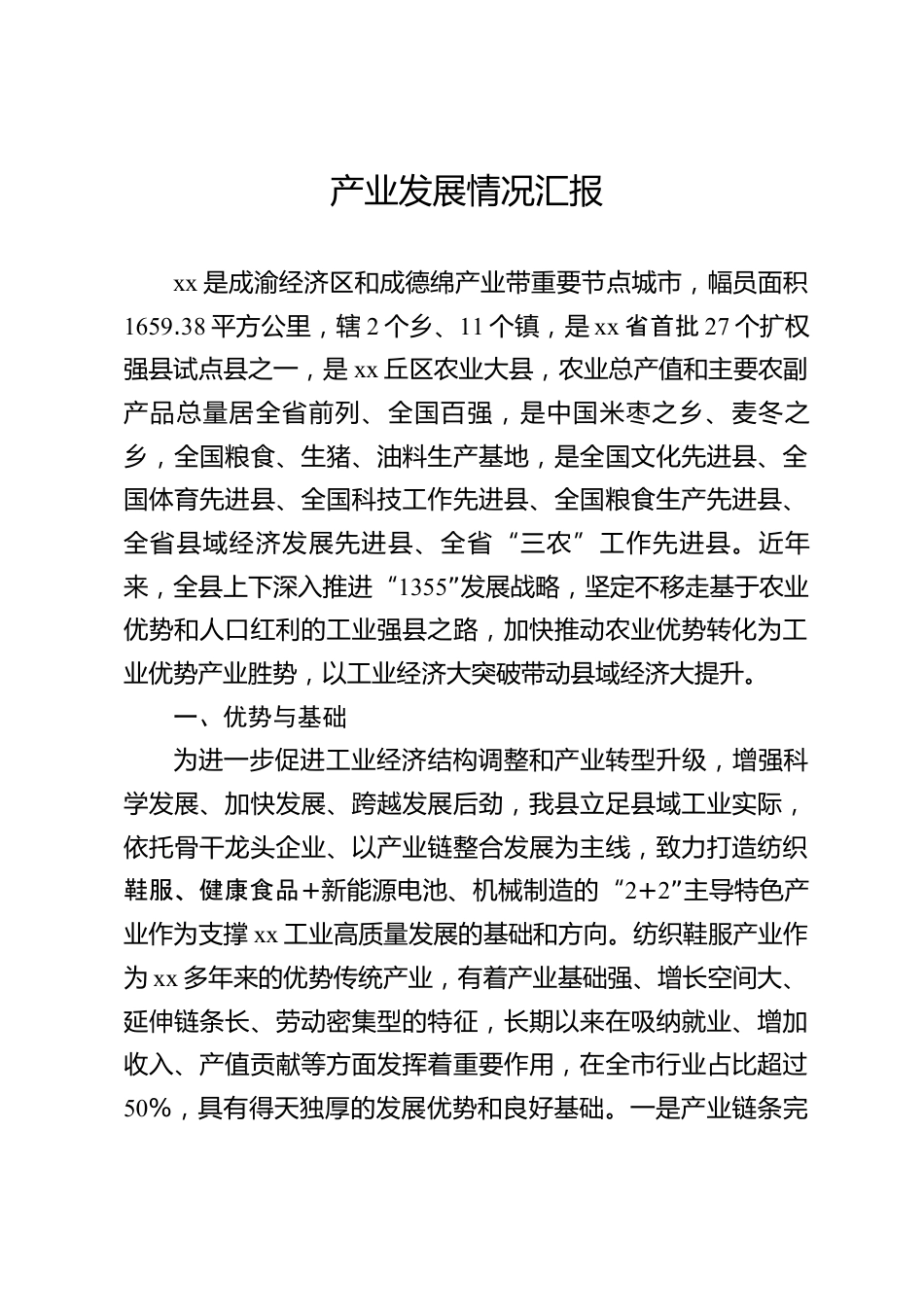 產(chǎn)業(yè)發(fā)展情況匯報xx是成渝經(jīng)濟區(qū)和成德綿產(chǎn)業(yè)帶重要節(jié)點城市,幅員面積1659.38平方公里,轄2個鄉(xiāng)、11個鎮(zhèn),是xx省首批27個擴權(quán)強縣試點縣之一,是xx丘區(qū)農(nóng)業(yè)大縣,農(nóng)業(yè)總產(chǎn)值和主要農(nóng)副產(chǎn)品總量居全省前列、全國百強,是中國米棗之鄉(xiāng)、麥冬之鄉(xiāng),全國糧食、生豬、油料生產(chǎn)基地,是全國文化先進縣、全國體育先進縣、全國科技工作先進縣、全國糧食生產(chǎn)先進縣、全省縣域經(jīng)濟發(fā)展先進縣、全省“三農(nóng)”工作先進縣。近年來,全縣上下深入推進“1355”發(fā)展戰(zhàn)略,堅定不移走基于農(nóng)業(yè)優(yōu)勢和人口紅利的工業(yè)強縣之路,加快推動農(nóng)業(yè)優(yōu)勢轉(zhuǎn)化為工業(yè)優(yōu)勢產(chǎn)業(yè)勝勢,以工業(yè)經(jīng)濟大突破帶動...