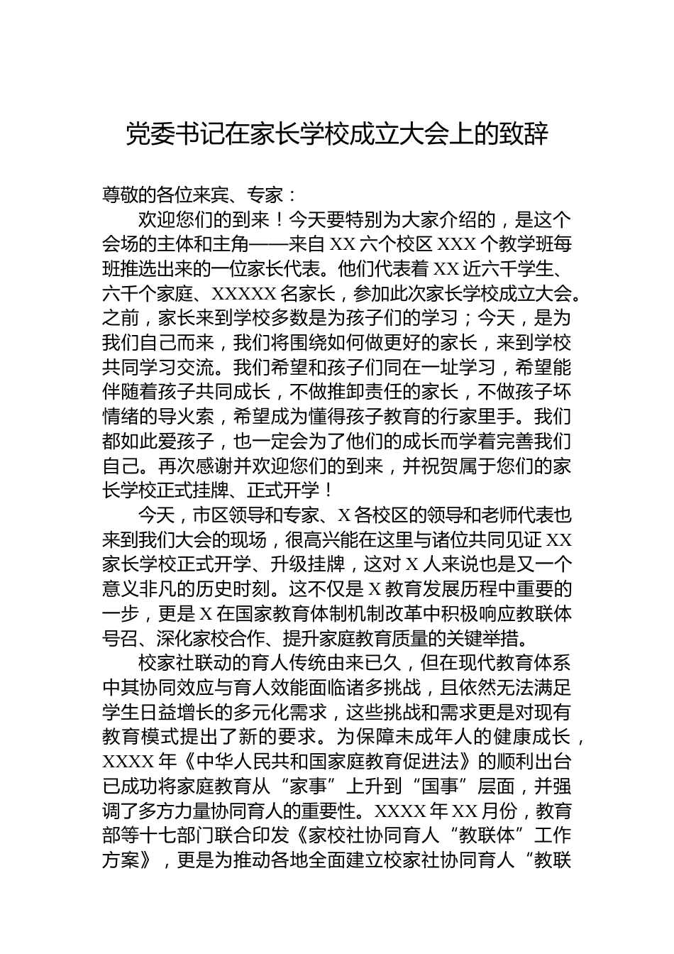 黨委書記在家長學(xué)校成立大會上的致辭尊敬的各位來賓、專家:歡迎您們的到來!今天要特別為大家介紹的,是這個會場的主體和主角——來自XX六個校區(qū)XXX個教學(xué)班每班推選出來的一位家長代表。他們代表著XX近六千學(xué)生、六千個家庭、XXXXX名家長,參加此次家長學(xué)校成立大會。之前,家長來到學(xué)校多數(shù)是為孩子們的學(xué)習(xí);今天,是為我們自己而來,我們將圍繞如何做更好的家長,來到學(xué)校共同學(xué)習(xí)交流。我們希望和孩子們同在一址學(xué)習(xí),希望能伴隨著孩子共同成長,不做推卸責(zé)任的家長,不做孩子壞情緒的導(dǎo)火索,希望成為懂得孩子教育的行家里手。我們都如此愛孩子,也一定會為了他們...