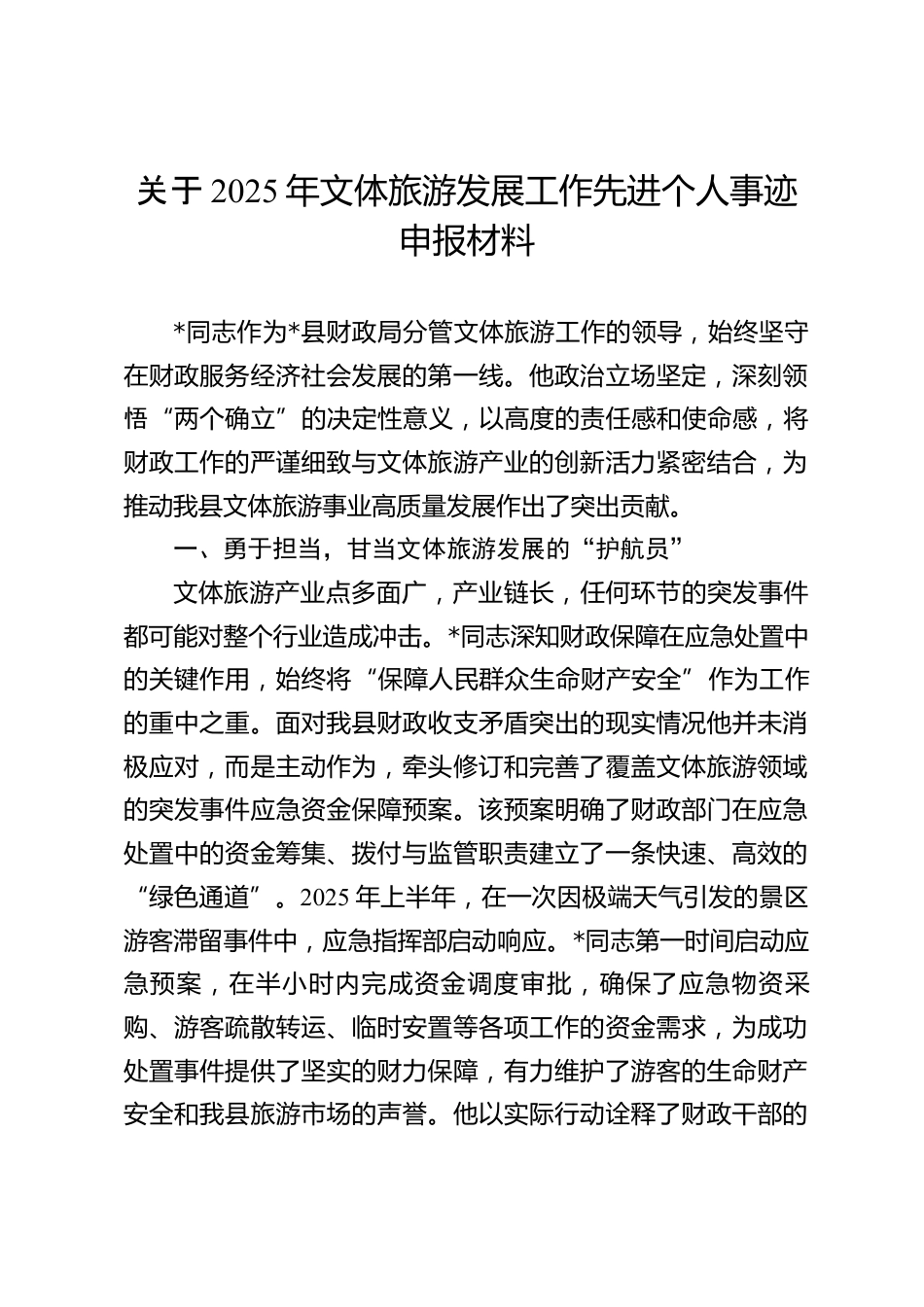 關(guān)于2025年文體旅游發(fā)展工作先進(jìn)個(gè)人事跡申報(bào)材料*同志作為*縣財(cái)政局分管文體旅游工作的領(lǐng)導(dǎo),始終堅(jiān)守在財(cái)政服務(wù)經(jīng)濟(jì)社會(huì)發(fā)展的第一線。他政治立場堅(jiān)定,深刻領(lǐng)悟“兩個(gè)確立”的決定性意義,以高度的責(zé)任感和使命感,將財(cái)政工作的嚴(yán)謹(jǐn)細(xì)致與文體旅游產(chǎn)業(yè)的創(chuàng)新活力緊密結(jié)合,為推動(dòng)我縣文體旅游事業(yè)高質(zhì)量發(fā)展作出了突出貢獻(xiàn)。一、勇于擔(dān)當(dāng),甘當(dāng)文體旅游發(fā)展的“護(hù)航員”文體旅游產(chǎn)業(yè)點(diǎn)多面廣,產(chǎn)業(yè)鏈長,任何環(huán)節(jié)的突發(fā)事件都可能對整個(gè)行業(yè)造成沖擊。*同志深知財(cái)政保障在應(yīng)急處置中的關(guān)鍵作用,始終將“保障人民群眾生命財(cái)產(chǎn)安全”作為工作的重中之重。面對我縣財(cái)政...