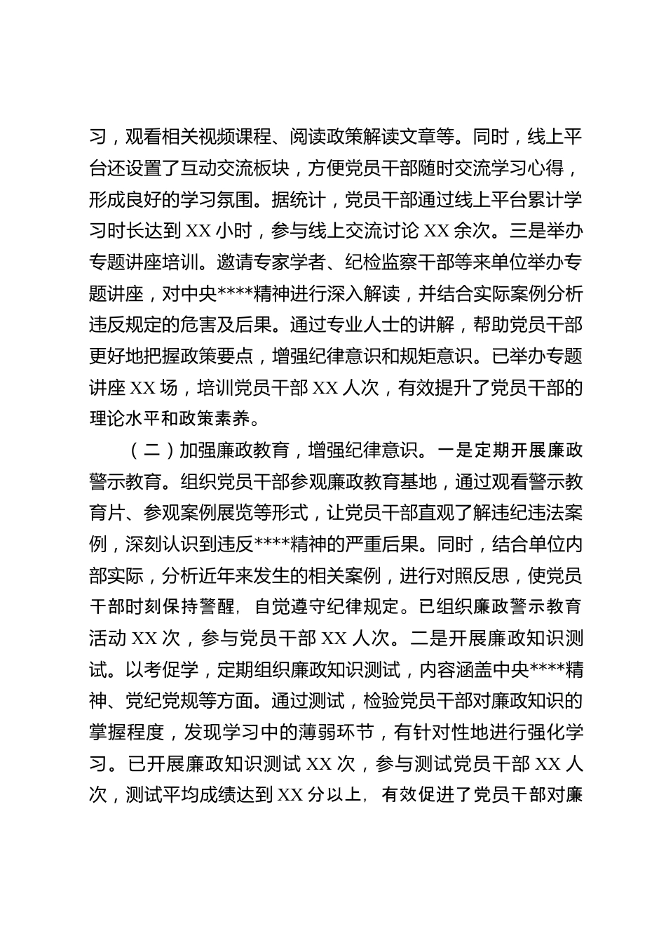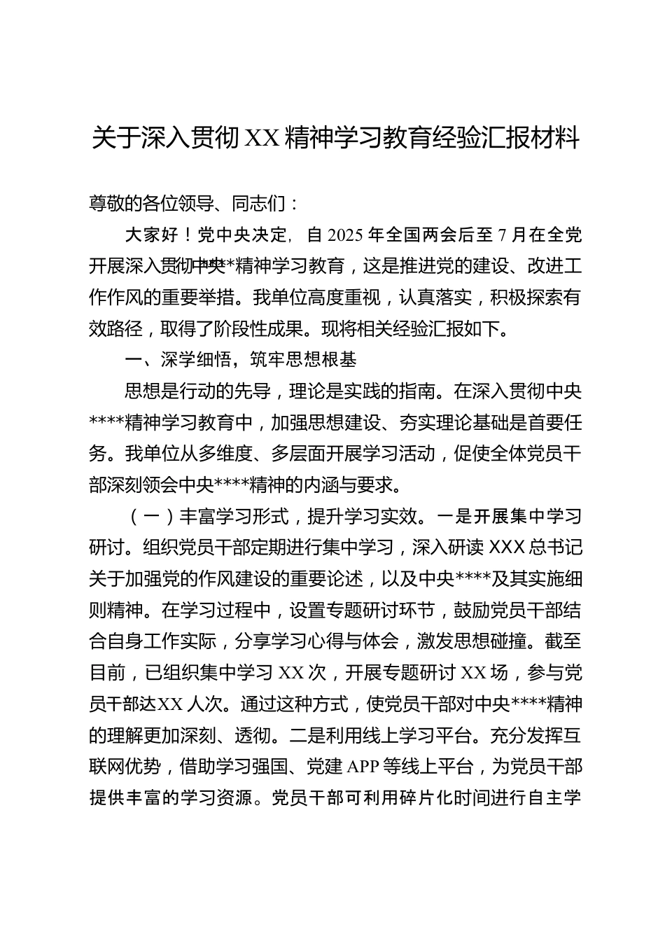關(guān)于深入貫徹XX精神學(xué)習(xí)教育經(jīng)驗匯報材料尊敬的各位領(lǐng)導(dǎo)、同志們:大家好!黨中央決定,自2025年全國兩會后至7月在全黨開展深入貫徹中央****精神學(xué)習(xí)教育,這是推進黨的建設(shè)、改進工作作風(fēng)的重要舉措。我單位高度重視,認真落實,積極探索有效路徑,取得了階段性成果。現(xiàn)將相關(guān)經(jīng)驗匯報如下。一、深學(xué)細悟,筑牢思想根基思想是行動的先導(dǎo),理論是實踐的指南。在深入貫徹中央****精神學(xué)習(xí)教育中,加強思想建設(shè)、夯實理論基礎(chǔ)是首要任務(wù)。我單位從多維度、多層面開展學(xué)習(xí)活動,促使全體黨員干部深刻領(lǐng)會中央****精神的內(nèi)涵與要求。(一)豐富學(xué)習(xí)形式,提升學(xué)習(xí)實效。一是...