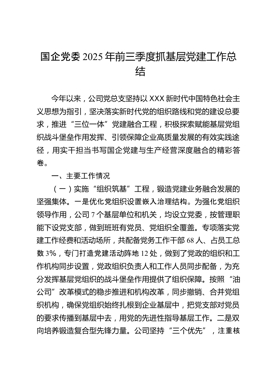 國企黨委2025年前三季度抓基層黨建工作總結(jié)今年以來,公司黨總支堅持以XXX新時代中國特色社會主義思想為指引,堅決落實新時代黨的組織路線和黨的建設(shè)總要求,推進“三位一體”黨建融合工程,積極探索賦能基層黨組織戰(zhàn)斗堡壘作用發(fā)揮、引領(lǐng)保障企業(yè)高質(zhì)量發(fā)展的有效實踐途徑,用實干擔(dān)當(dāng)書寫國企黨建與生產(chǎn)經(jīng)營深度融合的精彩答卷。一、主要工作情況(一)實施“組織筑基”工程,鍛造黨建業(yè)務(wù)融合發(fā)展的堅強集體。一是化黨置嵌入治理構(gòu)。化黨優(yōu)組織設(shè)結(jié)為強組織領(lǐng)導(dǎo)作用,公司7個基層單位和機關(guān),均設(shè)立黨委,按管理職能下設(shè)黨支部,做到班班有黨員、黨組織全覆蓋。專項落...