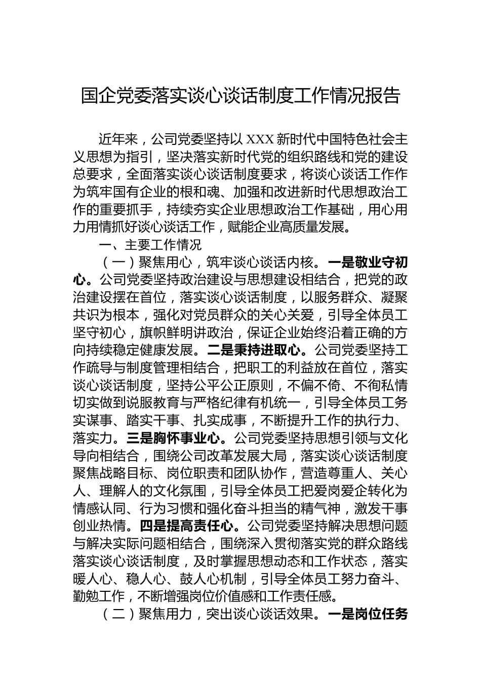 國企黨委落實(shí)談心談話制度工作情況報告近年來,公司黨委堅(jiān)持以XXX新時代中國特色社會主義思想為指引,堅(jiān)決落實(shí)新時代黨的組織路線和黨的建設(shè)總要求,全面落實(shí)談心談話制度要求,將談心談話工作作為筑牢國有企業(yè)的根和魂、加強(qiáng)和改進(jìn)新時代思想政治工作的重要抓手,持續(xù)夯實(shí)企業(yè)思想政治工作基礎(chǔ),用心用力用情抓好談心談話工作,賦能企業(yè)高質(zhì)量發(fā)展。一、主要工作情況(一)聚焦用心,筑牢談心談話內(nèi)核。一是敬業(yè)守初心。公司黨委堅(jiān)持政治建設(shè)與思想建設(shè)相結(jié)合,把黨的政治建設(shè)擺在首位,落實(shí)談心談話制度,以服務(wù)群眾、凝聚共識為根本,強(qiáng)化對黨員群眾的關(guān)心關(guān)愛,引導(dǎo)...