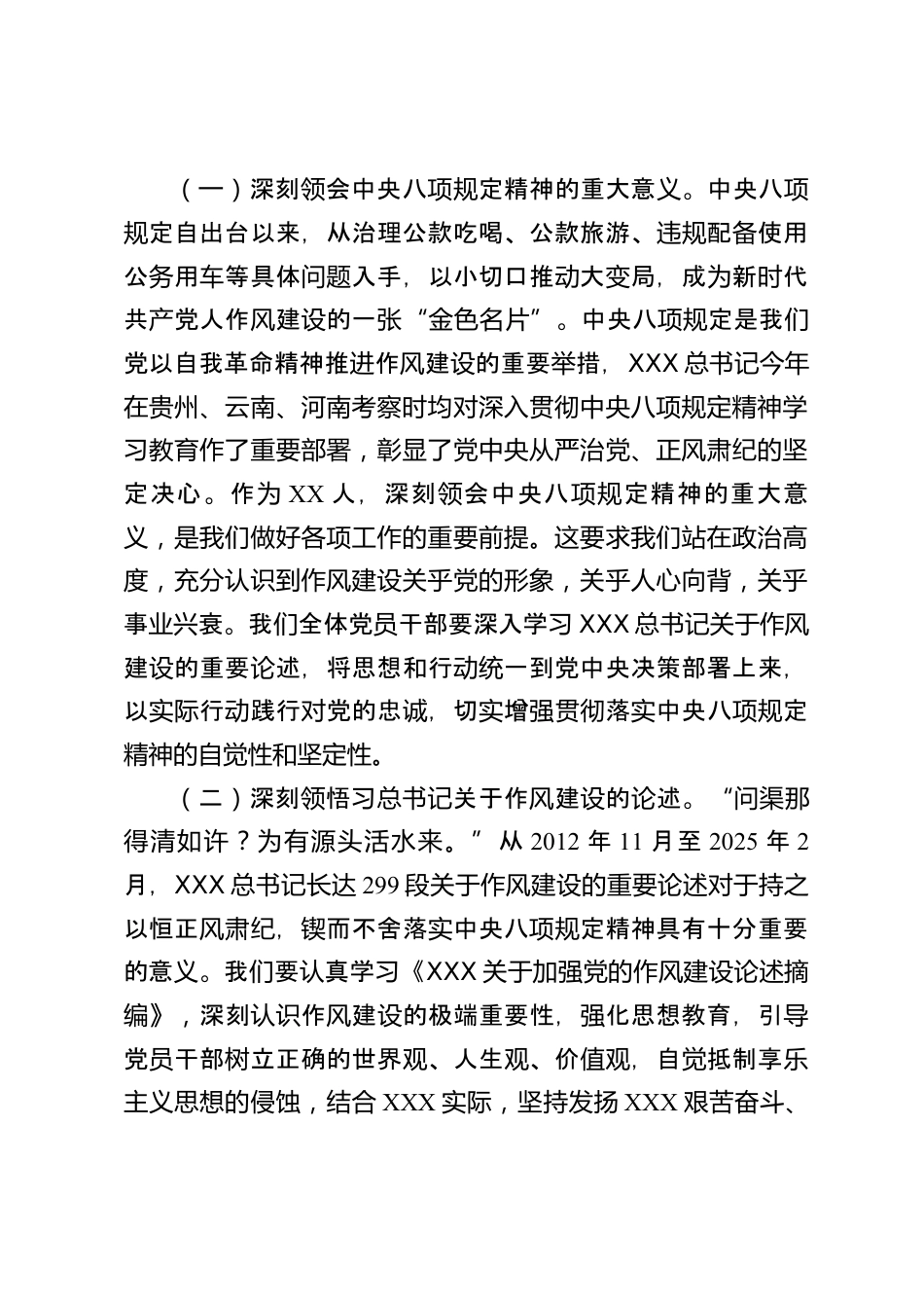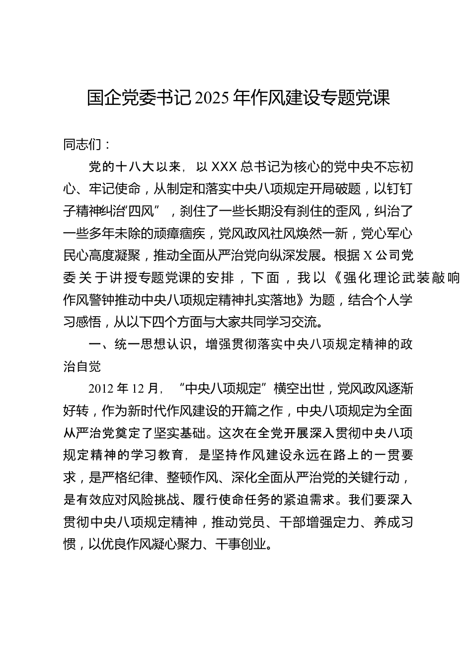 國企黨委書記2025年作風建設專題黨課同志們:黨的十八大以來,以XXX總書記為核心的黨中央不忘初心、牢記使命,從制定和落實中央八項規(guī)定開局破題,以釘釘子精神糾治“四風”,剎住了一些長期沒有剎住的歪風,糾治了一些多年未除的頑瘴痼疾,黨風政風社風煥然一新,黨心軍心民心高度凝聚,推動全面從嚴治黨向縱深發(fā)展。根據(jù)X公司黨委關于講授專題黨課的安排,下面,我以《強化理論武裝敲響作風警鐘推動中央八項規(guī)定精神扎實落地》為題,結合個人學習感悟,從以下四個方面與大家共同學習交流。一、統(tǒng)一思想認識,增強貫徹落實中央八項規(guī)定精神的政治自覺2012年12月,“中央...