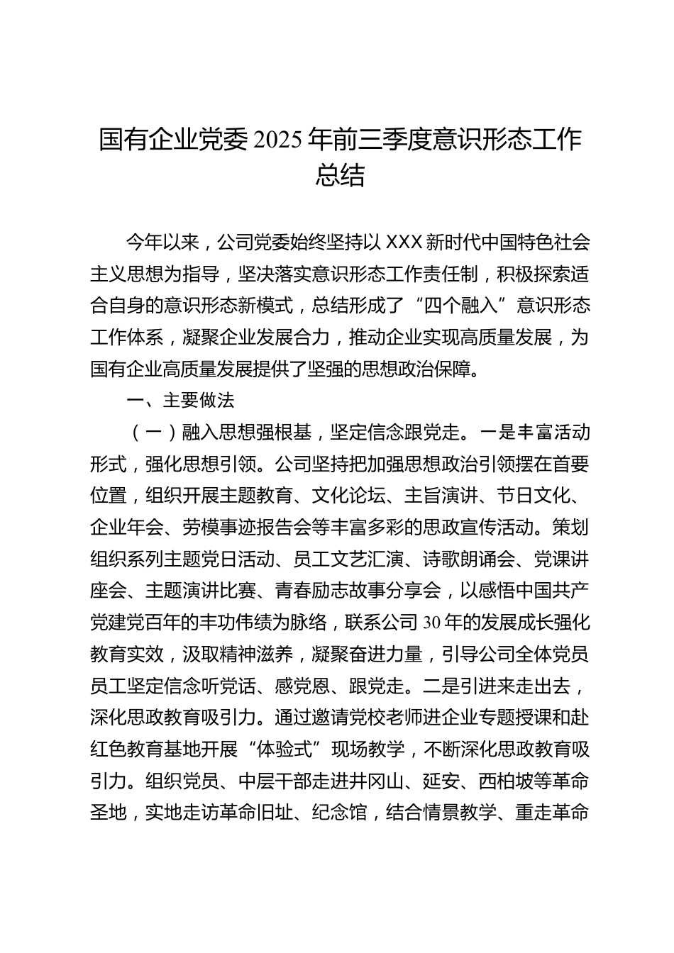國有企業(yè)黨委2025年前三季度意識形態(tài)工作總結(jié)今年以來,公司黨委始終堅持以XXX新時代中國特色社會主義思想為指導,堅決落實意識形態(tài)工作責任制,積極探索適合自身的意識形態(tài)新模式,總結(jié)形成了“四個融入”意識形態(tài)工作體系,凝聚企業(yè)發(fā)展合力,推動企業(yè)實現(xiàn)高質(zhì)量發(fā)展,為國有企業(yè)高質(zhì)量發(fā)展提供了堅強的思想政治保障。一、主要做法(一)融入思想強根基,堅定信念跟黨走。一是豐富活動形式,強化思想引領(lǐng)。公司堅持把加強思想政治引領(lǐng)擺在首要位置,組織開展主題教育、文化論壇、主旨演講、節(jié)日文化、企業(yè)年會、勞模事跡報告會等豐富多彩的思政宣傳活動。策劃組織系列...