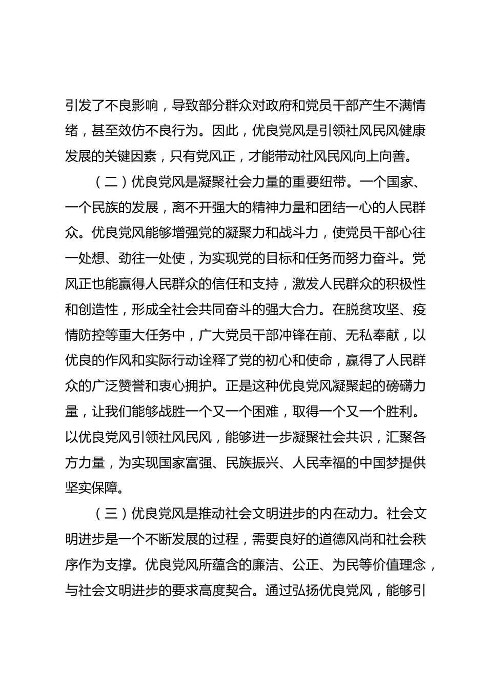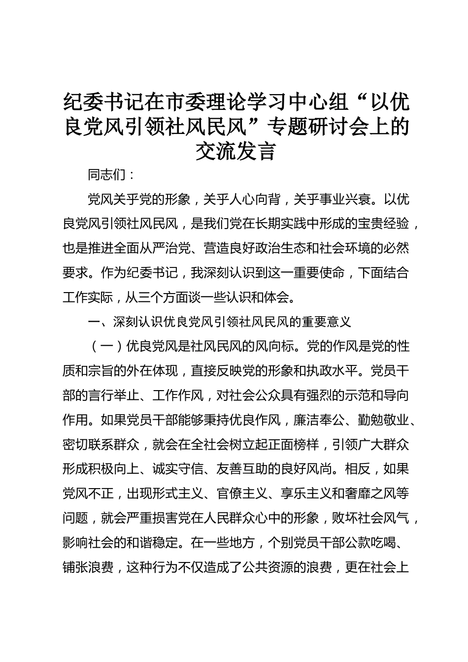 紀委書記在市委理論學(xué)習(xí)中心組“以優(yōu)良黨風引領(lǐng)社風民風”專題研討會上的交流發(fā)言同志們:黨風關(guān)乎黨的形象,關(guān)乎人心向背,關(guān)乎事業(yè)興衰。以優(yōu)良黨風引領(lǐng)社風民風,是我們黨在長期實踐中形成的寶貴經(jīng)驗,也是推進全面從嚴治黨、營造良好政治生態(tài)和社會環(huán)境的必然要求。作為紀委書記,我深刻認識到這一重要使命,下面結(jié)合工作實際,從三個方面談一些認識和體會。一、深刻認識優(yōu)良黨風引領(lǐng)社風民風的重要意義(一)優(yōu)良黨風是社風民風的風向標。黨的作風是黨的性質(zhì)和宗旨的外在體現(xiàn),直接反映黨的形象和執(zhí)政水平。黨員干部的言行舉止、工作作風,對社會公眾具有強烈的示范...