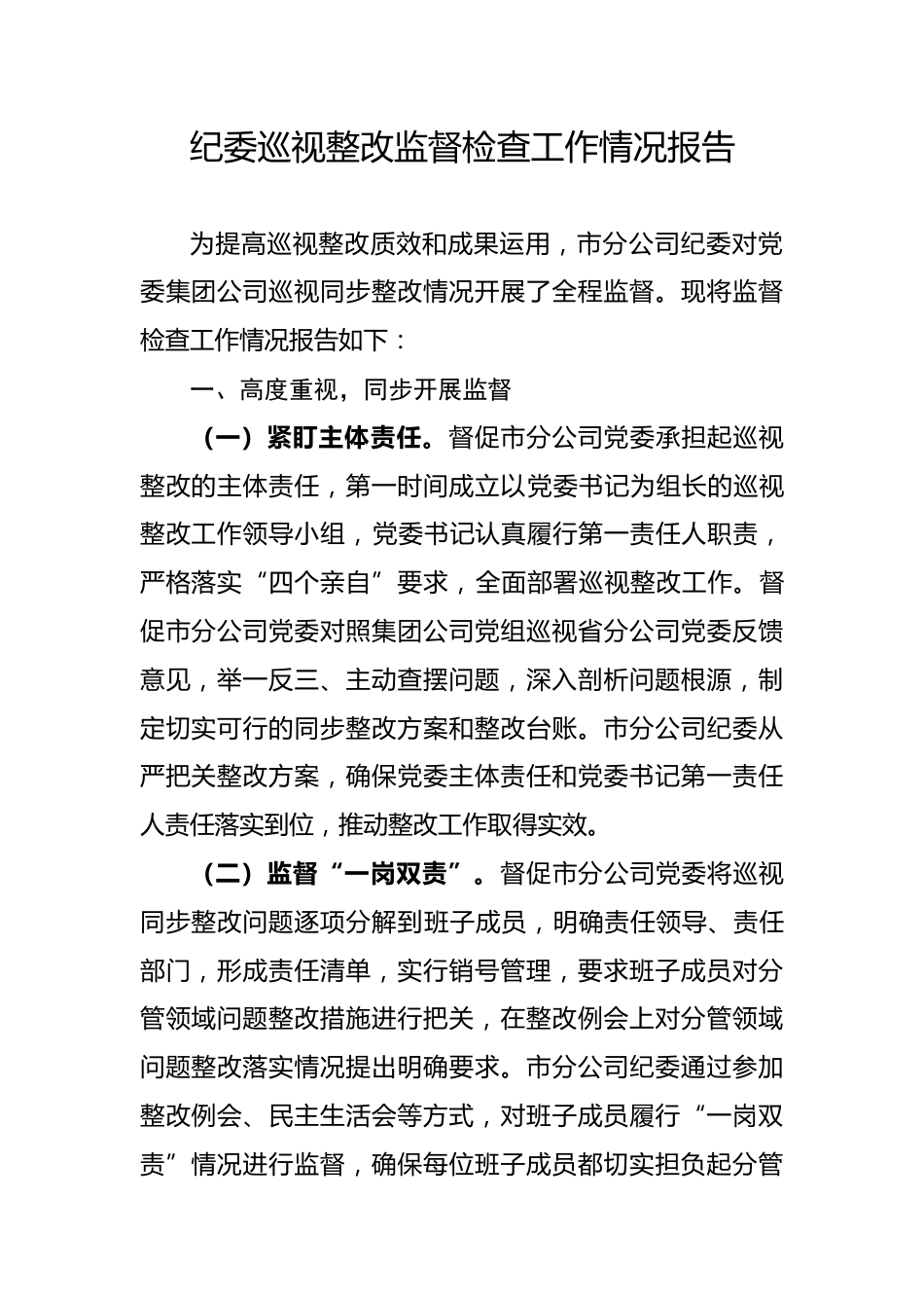 紀(jì)委巡視整改監(jiān)督檢查工作情況報告為提高巡視整改質(zhì)效和成果運用,市分公司紀(jì)委對黨委集團公司巡視同步整改情況開展了全程監(jiān)督?,F(xiàn)將監(jiān)督檢查工作情況報告如下:一、高度重視,同步開展監(jiān)督(一)緊盯主體責(zé)任。督促市分公司黨委承擔(dān)起巡視整改的主體責(zé)任,第一時間成立以黨委書記為組長的巡視整改工作領(lǐng)導(dǎo)小組,黨委書記認(rèn)真履行第一責(zé)任人職責(zé),嚴(yán)格落實“四個親自”要求,全面部署巡視整改工作。督促市分公司黨委對照集團公司黨組巡視省分公司黨委反饋意見,舉一反三、主動查擺問題,深入剖析問題根源,制定切實可行的同步整改方案和整改臺賬。市分公司紀(jì)委從嚴(yán)把關(guān)整...