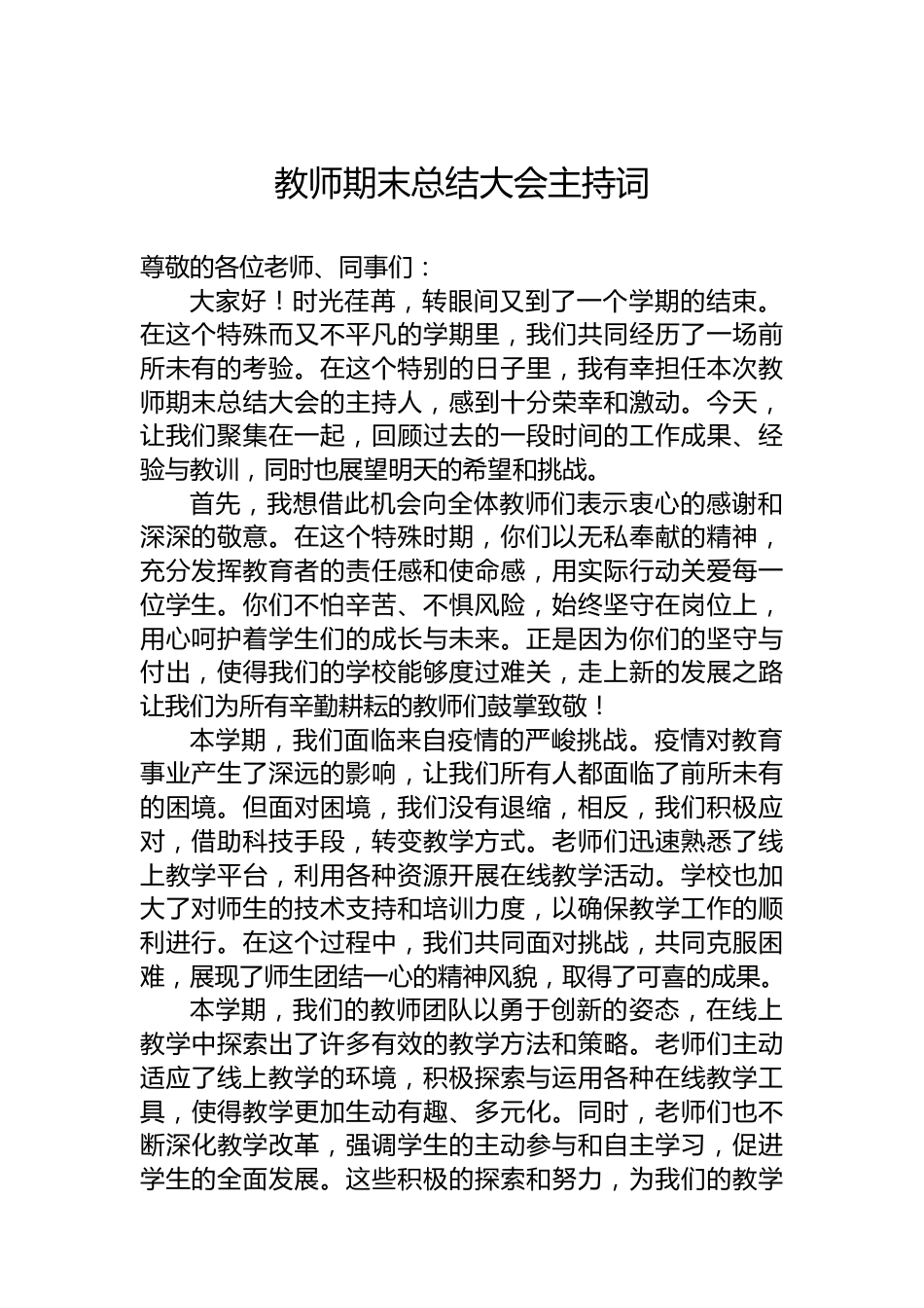 教師期末總結(jié)大會(huì)主持詞尊敬的各位老師、同事們:大家好!時(shí)光荏苒,轉(zhuǎn)眼間又到了一個(gè)學(xué)期的結(jié)束。在這個(gè)特殊而又不平凡的學(xué)期里,我們共同經(jīng)歷了一場(chǎng)前所未有的考驗(yàn)。在這個(gè)特別的日子里,我有幸擔(dān)任本次教師期末總結(jié)大會(huì)的主持人,感到十分榮幸和激動(dòng)。今天,讓我們聚集在一起,回顧過(guò)去的一段時(shí)間的工作成果、經(jīng)驗(yàn)與教訓(xùn),同時(shí)也展望明天的希望和挑戰(zhàn)。首先,我想借此機(jī)會(huì)向全體教師們表示衷心的感謝和深深的敬意。在這個(gè)特殊時(shí)期,你們以無(wú)私奉獻(xiàn)的精神,充分發(fā)揮教育者的責(zé)任感和使命感,用實(shí)際行動(dòng)關(guān)愛(ài)每一位學(xué)生。你們不怕辛苦、不懼風(fēng)險(xiǎn),始終堅(jiān)守在崗位上,用心...