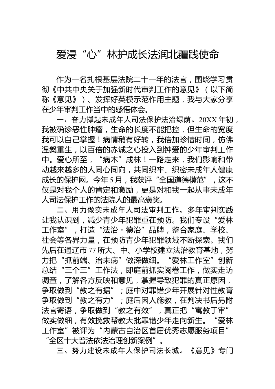 全國(guó)法院系統(tǒng)勞模法官代表座談會(huì)發(fā)言材料匯編(8篇)目錄1.愛(ài)浸“心”林護(hù)成長(zhǎng)法潤(rùn)北疆踐使命22.辦好涉老“小案件”彰顯為民“大擔(dān)當(dāng)”.............43.搭建干群關(guān)系“連心橋”做忠誠(chéng)干凈擔(dān)當(dāng)?shù)娜嗣穹ü?..............................................................................64.擔(dān)使命守初心揚(yáng)刑事司法公平正義之光................85.踐行高質(zhì)效辦好每一起民商事案件的價(jià)值追求.....106.讓青春在服務(wù)海洋強(qiáng)國(guó)建設(shè)中綻放光彩..............127.以司法為民情懷推動(dòng)基層法院審判工作提質(zhì)增效..148.做優(yōu)執(zhí)行工作讓公平正義更加可觸可感..............16愛(ài)浸“心...