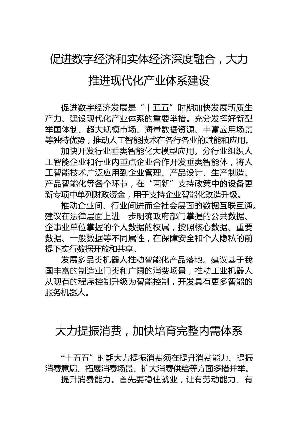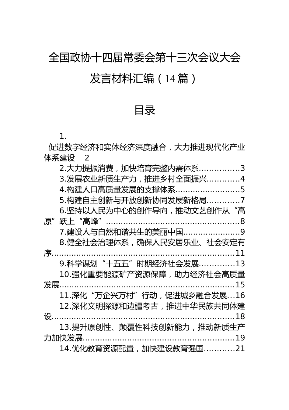 全國(guó)政協(xié)十四屆常委會(huì)第十三次會(huì)議大會(huì)發(fā)言材料匯編(14篇)目錄1.促進(jìn)數(shù)字經(jīng)濟(jì)和實(shí)體經(jīng)濟(jì)深度融合,大力推進(jìn)現(xiàn)代化產(chǎn)業(yè)體系建設(shè)22.大力提振消費(fèi),加快培育完整內(nèi)需體系................33.發(fā)展農(nóng)業(yè)新質(zhì)生產(chǎn)力,推進(jìn)鄉(xiāng)村全面振興.............44.構(gòu)建人口高質(zhì)量發(fā)展的支撐體系..........................55.構(gòu)建自主創(chuàng)新與開(kāi)放創(chuàng)新協(xié)同發(fā)展新格局.............76.堅(jiān)持以人民為中心的創(chuàng)作導(dǎo)向,推動(dòng)文藝創(chuàng)作從“高原”躍上“高峰”......................................................87.建設(shè)人與自然和諧共生的美麗中國(guó).......................98.健全社會(huì)治理體系,...