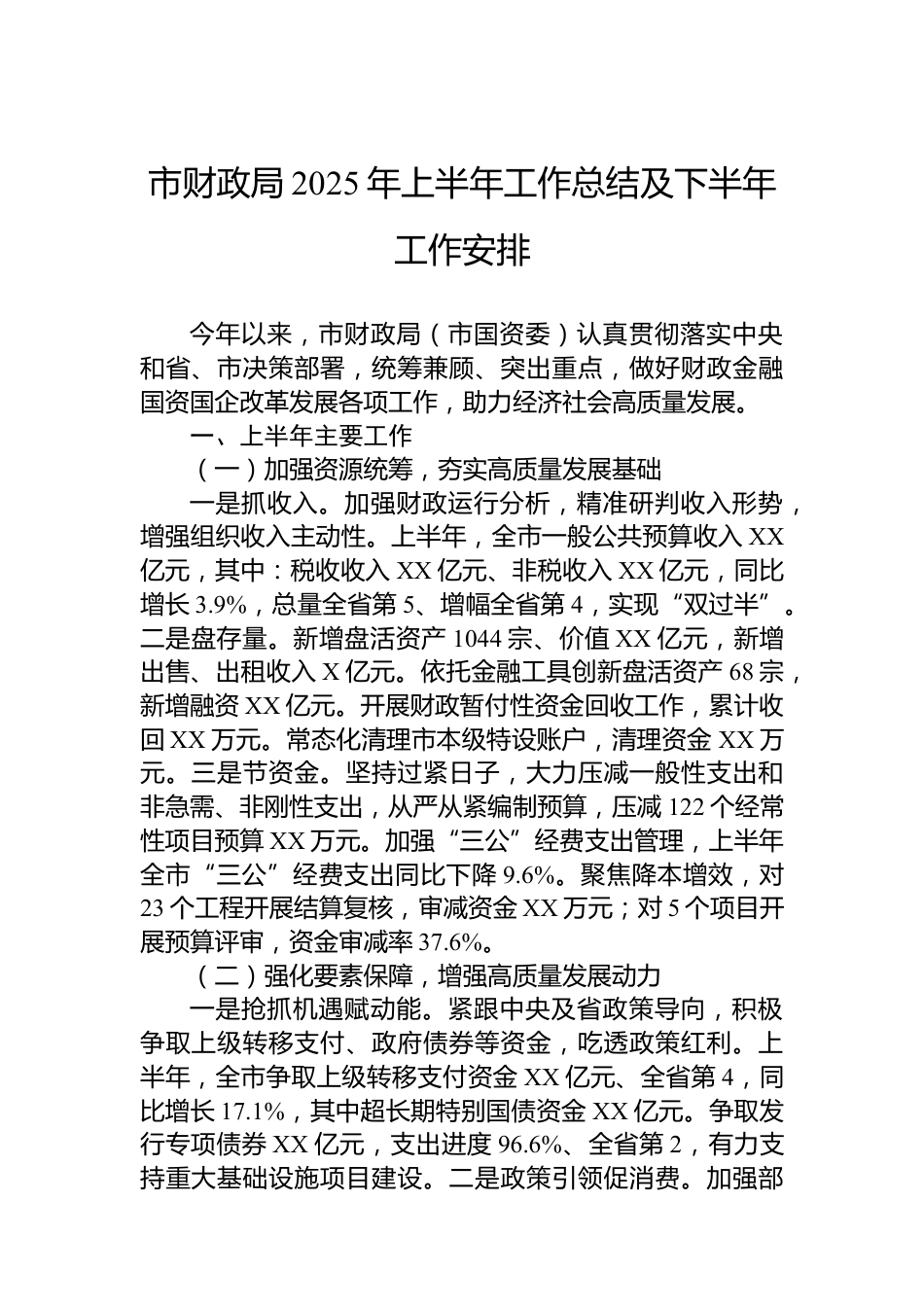 市財政局2025年上半年工作總結及下半年工作安排今年以來,市財政局(市國資委)認真貫徹落實中央和省、市決策部署,統(tǒng)籌兼顧、突出重點,做好財政金融國資國企改革發(fā)展各項工作,助力經(jīng)濟社會高質(zhì)量發(fā)展。一、上半年主要工作(一)加強資源統(tǒng)籌,夯實高質(zhì)量發(fā)展基礎一是抓收入。加強財政運行分析,精準研判收入形勢,增強組織收入主動性。上半年,全市一般公共預算收入XX億元,其中:稅收收入XX億元、非稅收入XX億元,同比增長3.9%,總量全省第5、增幅全省第4,實現(xiàn)“雙過半”。二是盤存量。新增盤活資產(chǎn)1044宗、價值XX億元,新增出售、出租收入X億元。依托金融工具創(chuàng)新...