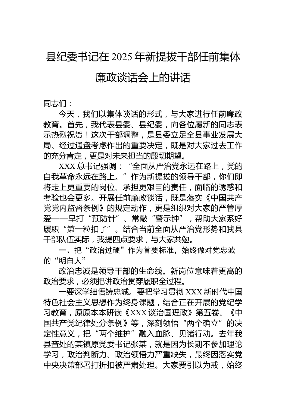 縣紀委書記在2025年新提拔干部任前集體廉政談話會上的講話