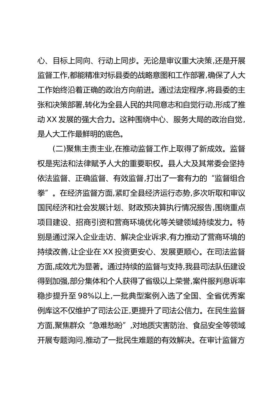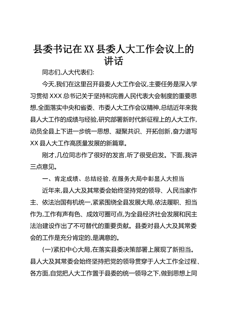 縣委書記在XX縣委人大工作會(huì)議上的講話同志們,人大代表們:今天,我們?cè)谶@里召開縣委人大工作會(huì)議,主要任務(wù)是深入學(xué)習(xí)貫徹XXX總書記關(guān)于堅(jiān)持和完善人民代表大會(huì)制度的重要思想,全面落實(shí)中央和省委、市委人大工作會(huì)議精神,總結(jié)近年來我縣人大工作的成績(jī)與經(jīng)驗(yàn),研究部署新時(shí)代新征程上的人大工作,動(dòng)員全縣上下進(jìn)一步統(tǒng)一思想、凝聚共識(shí)、開拓創(chuàng)新,奮力譜寫XX縣人大工作高質(zhì)量發(fā)展的新篇章。剛才,幾位同志作了很好的發(fā)言,聽了很受啟發(fā)。下面,我講三點(diǎn)意見。一、肯定成績(jī)、總結(jié)經(jīng)驗(yàn),在服務(wù)大局中彰顯人大擔(dān)當(dāng)近年來,縣人大及其常委會(huì)始終堅(jiān)持黨的領(lǐng)導(dǎo)、人民當(dāng)家作主、依法治國...