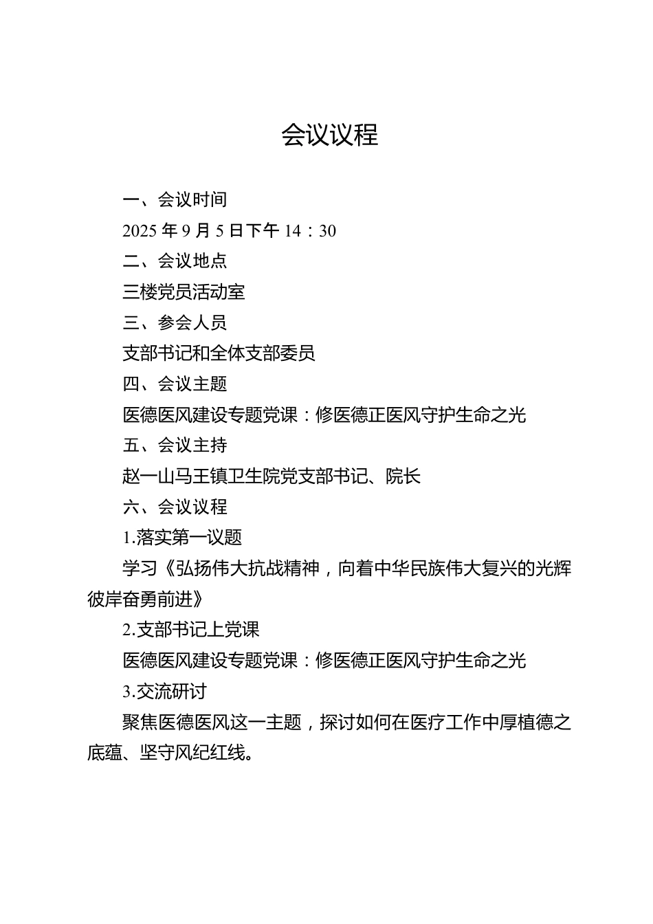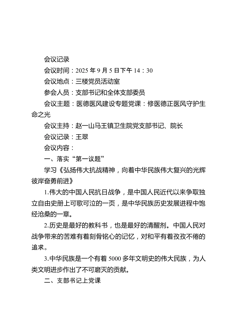 會(huì)議議程一、會(huì)議時(shí)間2025年9月5日下午14:30二、會(huì)議地點(diǎn)三樓黨員活動(dòng)室三、參會(huì)人員支部書記和全體支部委員四、會(huì)議主題醫(yī)德醫(yī)風(fēng)建設(shè)專題黨課:修醫(yī)德正醫(yī)風(fēng)守護(hù)生命之光五、會(huì)議主持趙一山馬王鎮(zhèn)衛(wèi)生院黨支部書記、院長六、會(huì)議議程1.落實(shí)第一議題學(xué)習(xí)《弘揚(yáng)偉大抗戰(zhàn)精神,向著中華民族偉大復(fù)興的光輝彼岸奮勇前進(jìn)》2.支部書記上黨課醫(yī)德醫(yī)風(fēng)建設(shè)專題黨課:修醫(yī)德正醫(yī)風(fēng)守護(hù)生命之光3.交流研討聚焦醫(yī)德醫(yī)風(fēng)這一主題,探討如何在醫(yī)療工作中厚植德之底蘊(yùn)、堅(jiān)守風(fēng)紀(jì)紅線。會(huì)議記錄會(huì)議時(shí)間:2025年9月5日下午14:30會(huì)議地點(diǎn):三樓黨員活動(dòng)室參會(huì)人員:支部書記和全體支部...