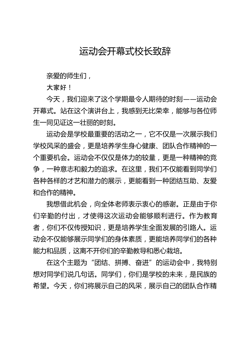 運動會開幕式校長致辭親愛的師生們,大家好!今天,我們迎來了這個學(xué)期最令人期待的時刻——運動會開幕式。站在這個演講臺上,我感到無比榮幸,能夠與各位師生一同見證這一壯麗的時刻。運動會是學(xué)校最重要的活動之一,它不僅是一次展示我們學(xué)校風(fēng)采的盛會,更是培養(yǎng)學(xué)生身心健康、團(tuán)隊合作精神的一個重要機會。運動會不僅僅是體力的較量,更是一種精神的競爭,一種意志和毅力的追求。在這里,我們不僅能看到同學(xué)們各種各樣的才藝和潛力的展示,更能看到一種團(tuán)結(jié)互助、友愛和合作的精神。我想借此機會,向全體老師表示衷心的感謝。正是由于你們辛勤的付出,才使得這次運動...