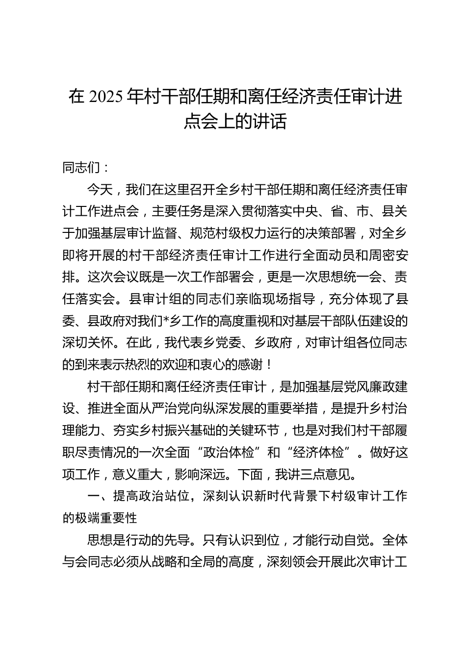 在2025年村干部任期和離任經(jīng)濟責任審計進點會上的講話