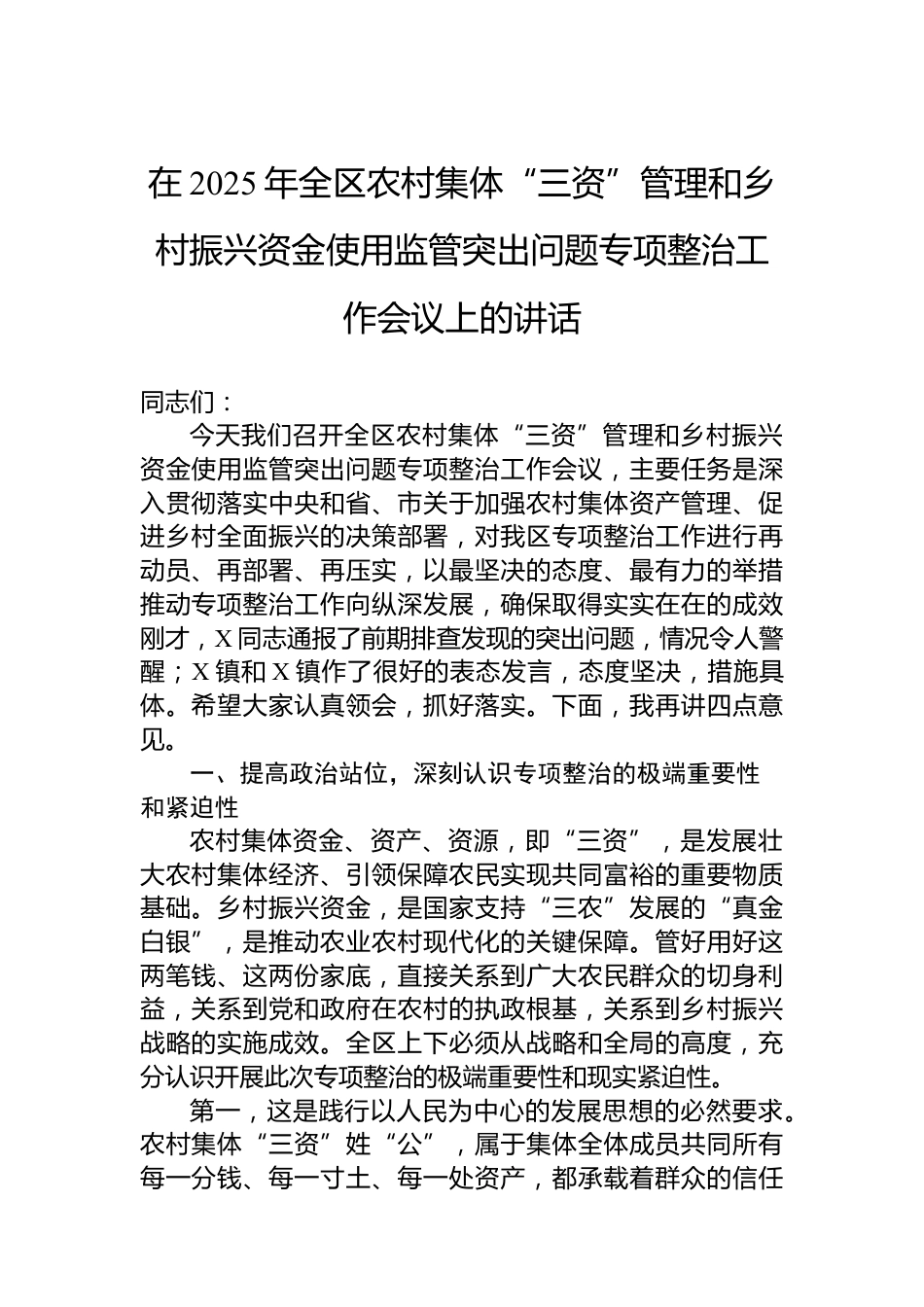 在2025年全區(qū)農(nóng)村集體“三資”管理和鄉(xiāng)村振興資金使用監(jiān)管突出問題專項(xiàng)整治工作會議上的講話