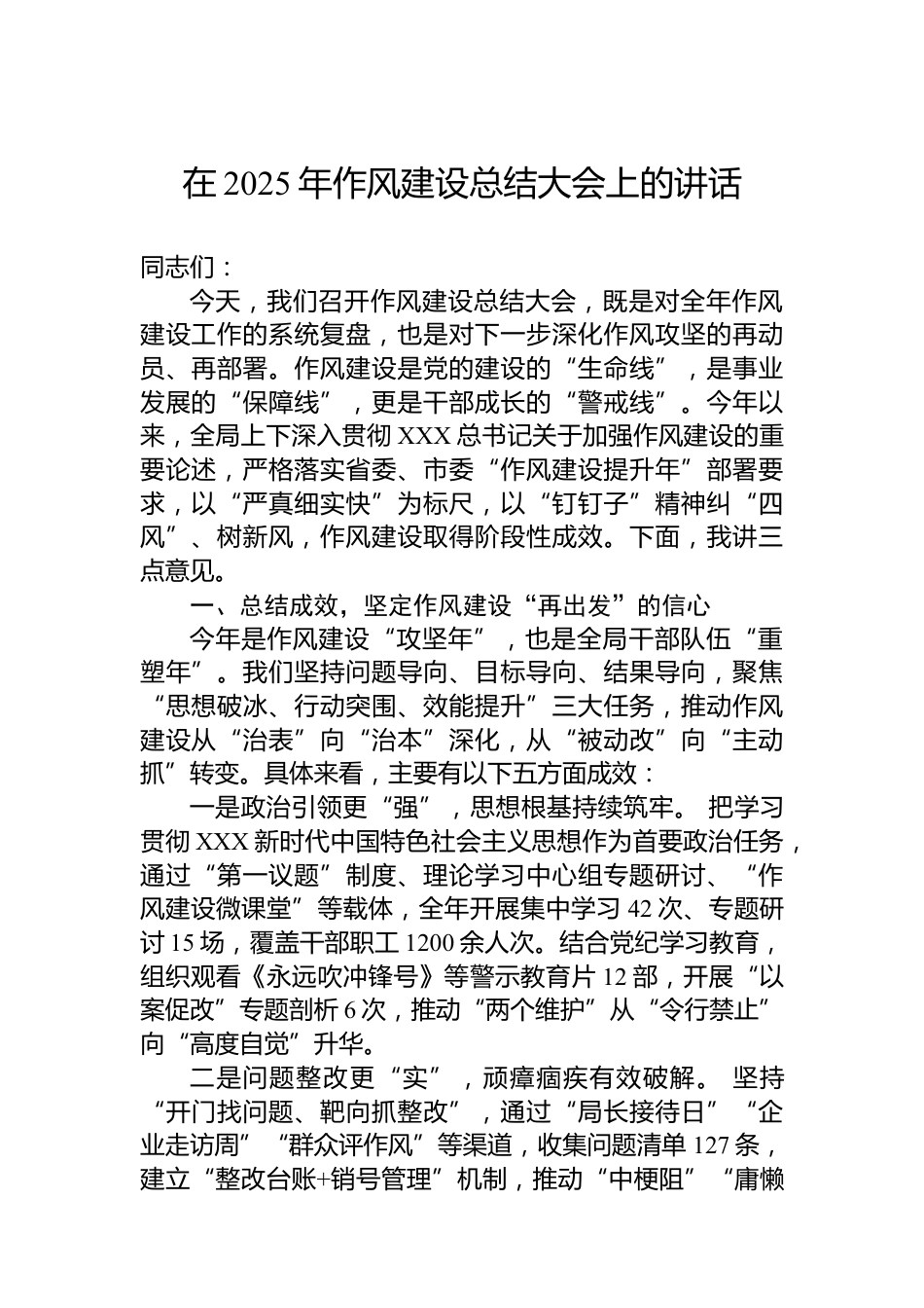 在2025年作風(fēng)建設(shè)總結(jié)大會上的講話同志們:今天,我們召開作風(fēng)建設(shè)總結(jié)大會,既是對全年作風(fēng)建設(shè)工作的系統(tǒng)復(fù)盤,也是對下一步深化作風(fēng)攻堅的再動員、再部署。作風(fēng)建設(shè)是黨的建設(shè)的“生命線”,是事業(yè)發(fā)展的“保障線”,更是干部成長的“警戒線”。今年以來,全局上下深入貫徹XXX總書記關(guān)于加強(qiáng)作風(fēng)建設(shè)的重要論述,嚴(yán)格落實省委、市委“作風(fēng)建設(shè)提升年”部署要求,以“嚴(yán)真細(xì)實快”為標(biāo)尺,以“釘釘子”精神糾“四風(fēng)”、樹新風(fēng),作風(fēng)建設(shè)取得階段性成效。下面,我講三點(diǎn)意見。一、總結(jié)成效,堅定作風(fēng)建設(shè)“再出發(fā)”的信心今年是作風(fēng)建設(shè)“攻堅年”,也是全局干部隊伍“...