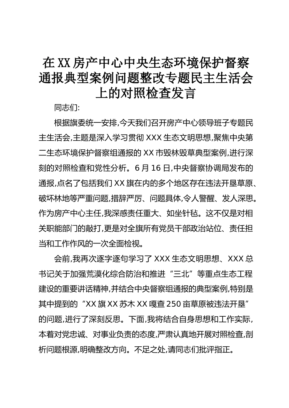 在XX房產(chǎn)中心中央生態(tài)環(huán)境保護(hù)督察通報(bào)典型案例問(wèn)題整改專(zhuān)題民主生活會(huì)上的對(duì)照檢查發(fā)言