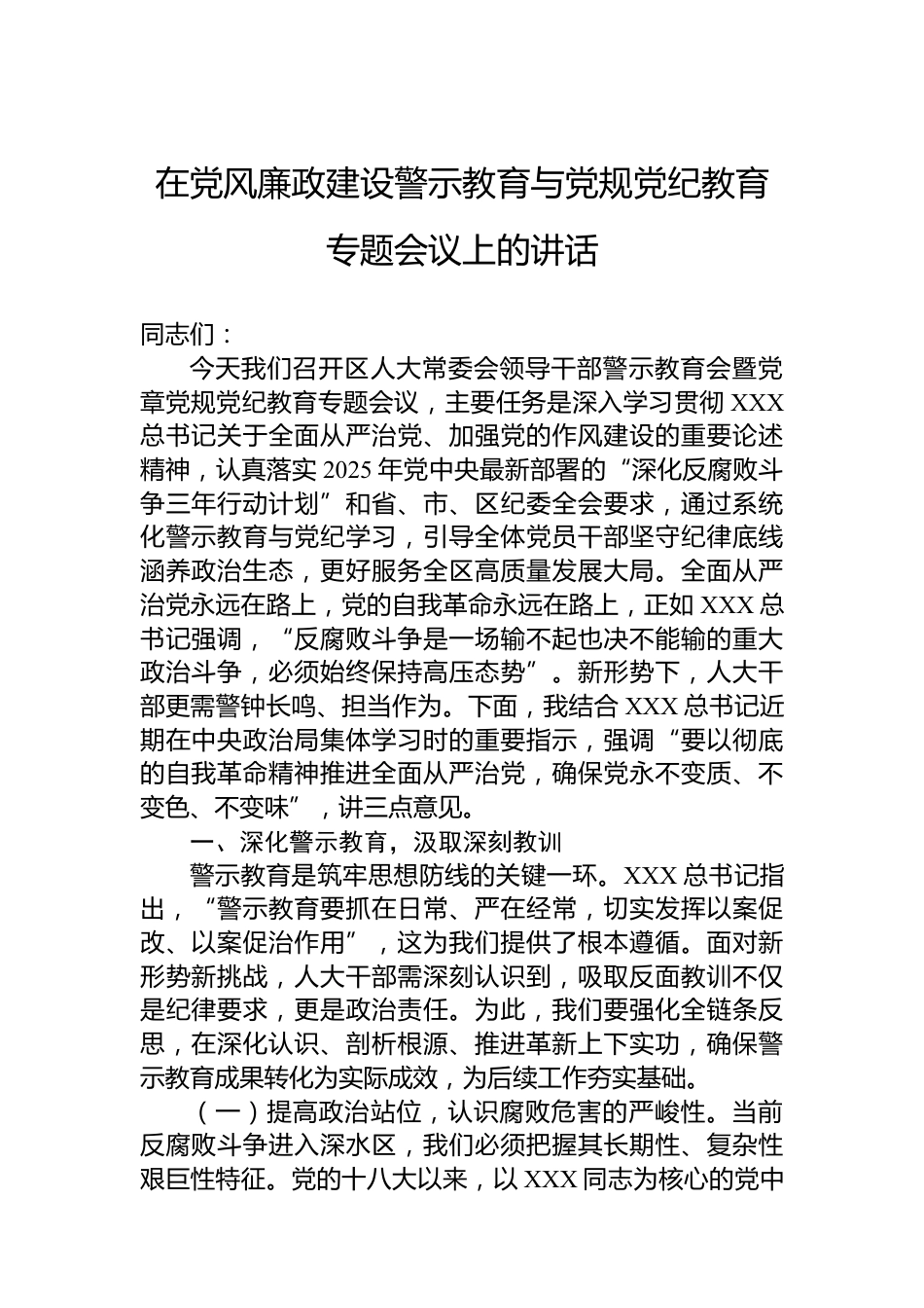 在黨風(fēng)廉政建設(shè)警示教育大會(huì)上的講話材料匯編(4篇)(含集團(tuán)公司)目錄1.在黨風(fēng)廉政建設(shè)警示教育與黨規(guī)黨紀(jì)教育專題會(huì)議上的講話.................................................................................................22.在黨風(fēng)廉政建設(shè)警示教育大會(huì)上的講話(集團(tuán)公司)....103.在黨風(fēng)廉政建設(shè)警示教育大會(huì)上的講話(集團(tuán)公司)....164.在xx黨支部違反作風(fēng)建設(shè)精神警示教育會(huì)上的講話.......23在黨風(fēng)廉政建設(shè)警示教育與黨規(guī)黨紀(jì)教育專題會(huì)議上的講話同志們:今天我們召開區(qū)人大常委會(huì)領(lǐng)導(dǎo)干部警示教育會(huì)暨黨章黨規(guī)黨紀(jì)教育專題會(huì)議,主要任務(wù)是深入學(xué)習(xí)...