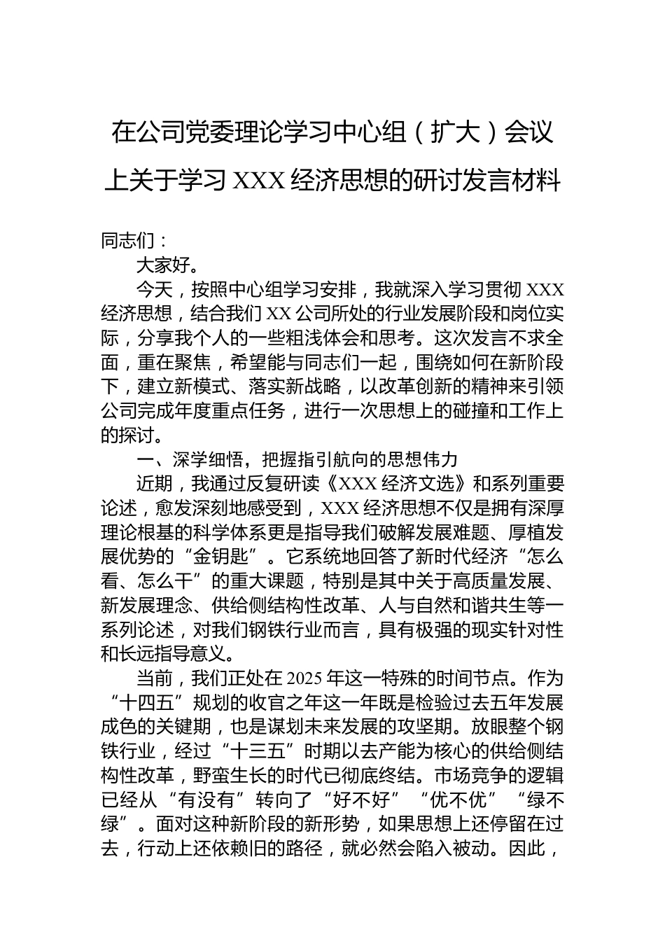 在公司黨委理論學(xué)習(xí)中心組(擴(kuò)大)會議上關(guān)于學(xué)習(xí)XXX經(jīng)濟(jì)思想的研討發(fā)言材料同志們:大家好。今天,按照中心組學(xué)習(xí)安排,我就深入學(xué)習(xí)貫徹XXX經(jīng)濟(jì)思想,結(jié)合我們XX公司所處的行業(yè)發(fā)展階段和崗位實際,分享我個人的一些粗淺體會和思考。這次發(fā)言不求全面,重在聚焦,希望能與同志們一起,圍繞如何在新階段下,建立新模式、落實新戰(zhàn)略,以改革創(chuàng)新的精神來引領(lǐng)公司完成年度重點任務(wù),進(jìn)行一次思想上的碰撞和工作上的探討。一、深學(xué)細(xì)悟,把握指引航向的思想偉力近期,我通過反復(fù)研讀《XXX經(jīng)濟(jì)文選》和系列重要論述,愈發(fā)深刻地感受到,XXX經(jīng)濟(jì)思想不僅是擁有深厚理論根基的...