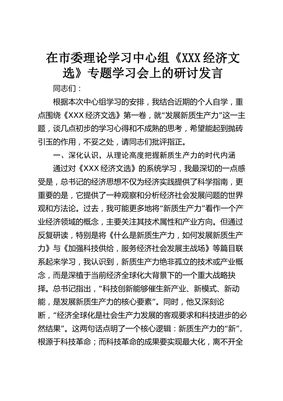 在市委理論學(xué)習(xí)中心組《XXX經(jīng)濟(jì)文選》專題學(xué)習(xí)會(huì)上的研討發(fā)言同志們:根據(jù)本次中心組學(xué)習(xí)的安排,我結(jié)合近期的個(gè)人自學(xué),重點(diǎn)圍繞《XXX“”經(jīng)濟(jì)文選》第一卷,就發(fā)展新質(zhì)生產(chǎn)力這一主題,談幾點(diǎn)初步的學(xué)習(xí)心得和不成熟的思考,希望能起到拋磚引玉的作用,不妥之處,請(qǐng)同志們批評(píng)指正。一、深化認(rèn)識(shí),從理論高度把握新質(zhì)生產(chǎn)力的時(shí)代內(nèi)涵通過對(duì)《XXX經(jīng)濟(jì)文選》的系統(tǒng)學(xué)習(xí),我最深切的一點(diǎn)感受是,總書記的經(jīng)濟(jì)思想不僅為經(jīng)濟(jì)實(shí)踐提供了科學(xué)指南,更重要的是,它提供了一種觀察和分析經(jīng)濟(jì)社會(huì)發(fā)展問題的世界“”觀和方法論。過去,我可能更多地將新質(zhì)生產(chǎn)力看作一個(gè)產(chǎn)業(yè)經(jīng)...