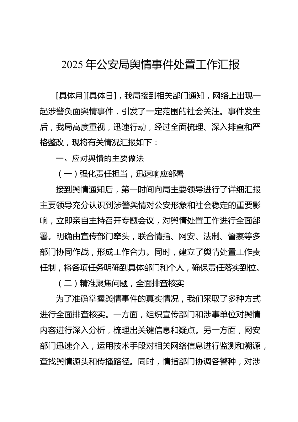 2025年公安局輿情事件處置工作匯報[具體月][具體日],我局接到相關(guān)部門通知,網(wǎng)絡(luò)上出現(xiàn)一起涉警負面輿情事件,引發(fā)了一定范圍的社會關(guān)注。事件發(fā)生后,我局高度重視,迅速行動,經(jīng)過全面梳理、深入排查和嚴格整改,現(xiàn)將有關(guān)情況匯報如下:一、應(yīng)對輿情的主要做法(一)強化責(zé)任擔當,迅速響應(yīng)部署接到輿情通知后,第一時間向局主要領(lǐng)導(dǎo)進行了詳細匯報主要領(lǐng)導(dǎo)充分認識到涉警輿情對公安形象和社會穩(wěn)定的重要影響,立即親自主持召開專題會議,對輿情處置工作進行全面部署。明確由宣傳部門牽頭,聯(lián)合情指、網(wǎng)安、法制、督察等多部門協(xié)同作戰(zhàn),形成工作合力。同時,建立了輿...