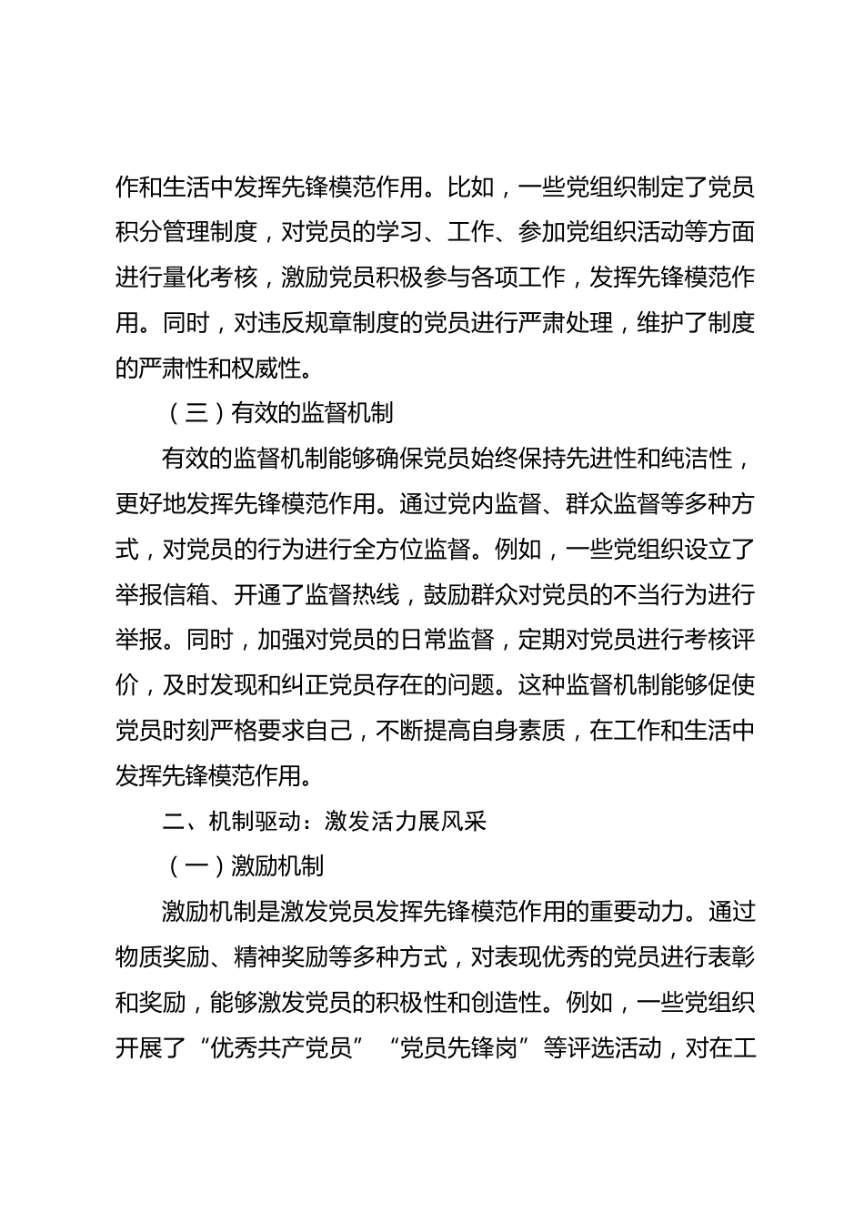 黨員先鋒模范帶頭作用發(fā)揮學(xué)習(xí)心得黨員的先鋒模范帶頭作用是黨的先進性的具體體現(xiàn),是黨始終保持強大凝聚力、戰(zhàn)斗力和生命力的重要保障。通過對黨員先鋒模范帶頭作用發(fā)揮相關(guān)的體制、機制、載體及案例的學(xué)習(xí),我深受啟發(fā),對如何更好地發(fā)揮黨員先鋒模范作用有了更為深刻的認識和思考。一、體制保障:堅實基礎(chǔ)促引領(lǐng)(一)科學(xué)合理的組織架構(gòu)完善的黨組織架構(gòu)是黨員發(fā)揮先鋒模范作用的基礎(chǔ)。合理設(shè)置黨組織,明確各級黨組織的職責(zé)和分工,能夠確保黨組織的各項工作有序開展。例如,在一些大型企業(yè)中,根據(jù)不同的部門和業(yè)務(wù)領(lǐng)域設(shè)置黨支部,使黨員能夠更好地融入工作實際,...