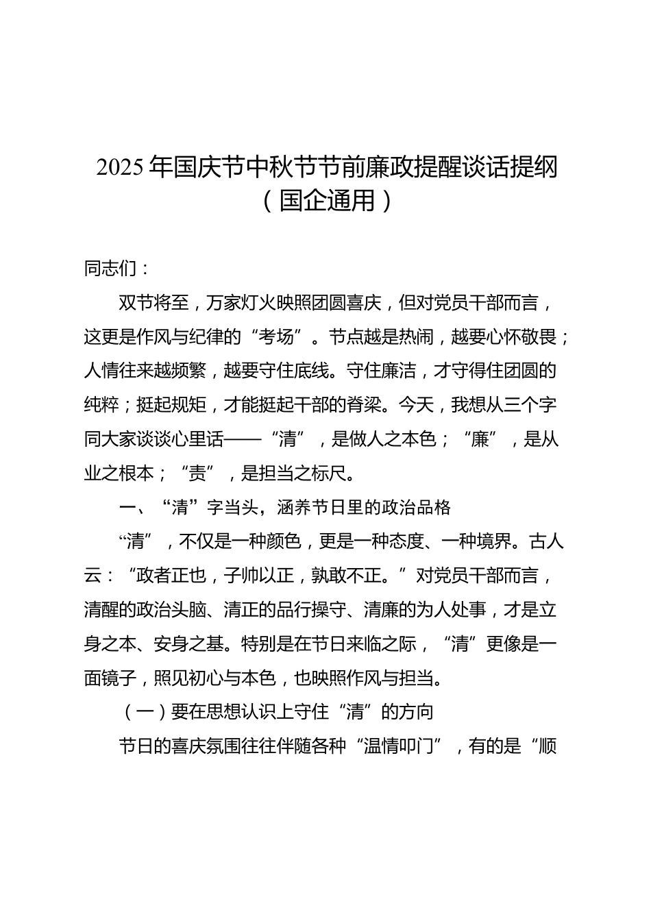 2025年國慶節(jié)中秋節(jié)節(jié)前廉政提醒談話提綱(國企通用)