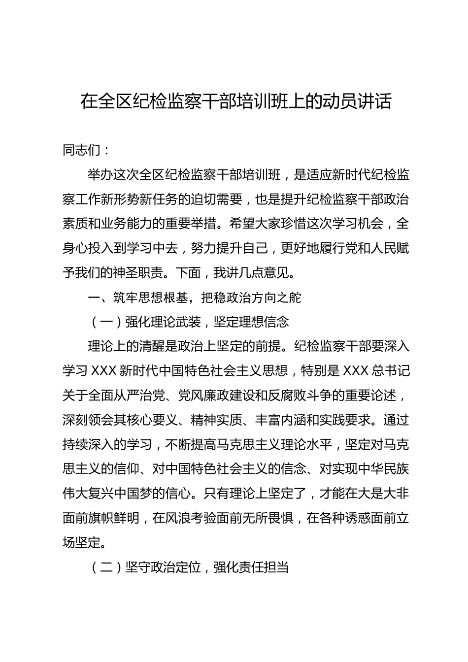 在全區(qū)紀(jì)檢監(jiān)察干部培訓(xùn)班上的動員講話同志們:舉辦這次全區(qū)紀(jì)檢監(jiān)察干部培訓(xùn)班,是適應(yīng)新時代紀(jì)檢監(jiān)察工作新形勢新任務(wù)的迫切需要,也是提升紀(jì)檢監(jiān)察干部政治素質(zhì)和業(yè)務(wù)能力的重要舉措。希望大家珍惜這次學(xué)習(xí)機(jī)會,全身心投入到學(xué)習(xí)中去,努力提升自己,更好地履行黨和人民賦予我們的神圣職責(zé)。下面,我講幾點(diǎn)意見。一、筑牢思想根基,把穩(wěn)政治方向之舵(一)強(qiáng)化理論武裝,堅(jiān)定理想信念理論上的清醒是政治上堅(jiān)定的前提。紀(jì)檢監(jiān)察干部要深入學(xué)習(xí)XXX新時代中國特色社會主義思想,特別是XXX總書記關(guān)于全面從嚴(yán)治黨、黨風(fēng)廉政建設(shè)和反腐敗斗爭的重要論述,深刻領(lǐng)會其核心要...
