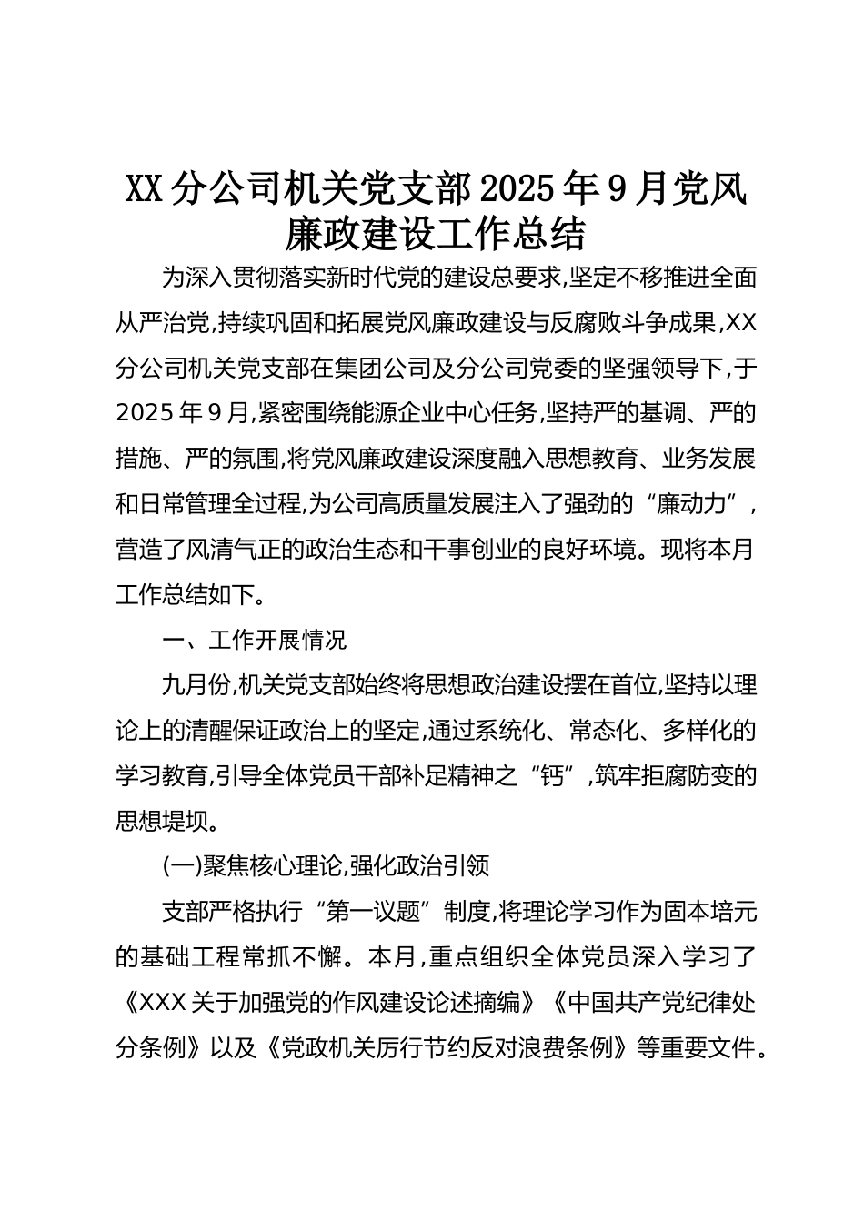XX分公司機(jī)關(guān)黨支部2025年9月黨風(fēng)廉政建設(shè)工作總結(jié)