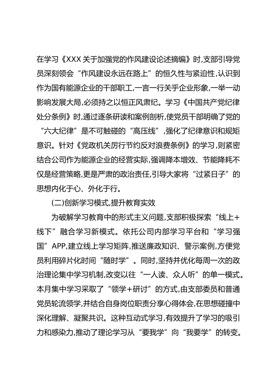 XX分公司機(jī)關(guān)黨支部2025年9月黨風(fēng)廉政建設(shè)工作總結(jié)為深入貫徹落實(shí)新時代黨的建設(shè)總要求,堅(jiān)定不移推進(jìn)全面從嚴(yán)治黨,持續(xù)鞏固和拓展黨風(fēng)廉政建設(shè)與反腐敗斗爭成果,XX分公司機(jī)關(guān)黨支部在集團(tuán)公司及分公司黨委的堅(jiān)強(qiáng)領(lǐng)導(dǎo)下,于2025年9月,緊密圍繞能源企業(yè)中心任務(wù),堅(jiān)持嚴(yán)的基調(diào)、嚴(yán)的措施、嚴(yán)的氛圍,將黨風(fēng)廉政建設(shè)深度融入思想教育、業(yè)務(wù)發(fā)展和日常管理全過程,為公司高質(zhì)量發(fā)展注入了強(qiáng)勁的“廉動力”,營造了風(fēng)清氣正的政治生態(tài)和干事創(chuàng)業(yè)的良好環(huán)境?,F(xiàn)將本月工作總結(jié)如下。一、工作開展情況九月份,機(jī)關(guān)黨支部始終將思想政治建設(shè)擺在首位,堅(jiān)持以理論上的清醒保證政治上的堅(jiān)...
