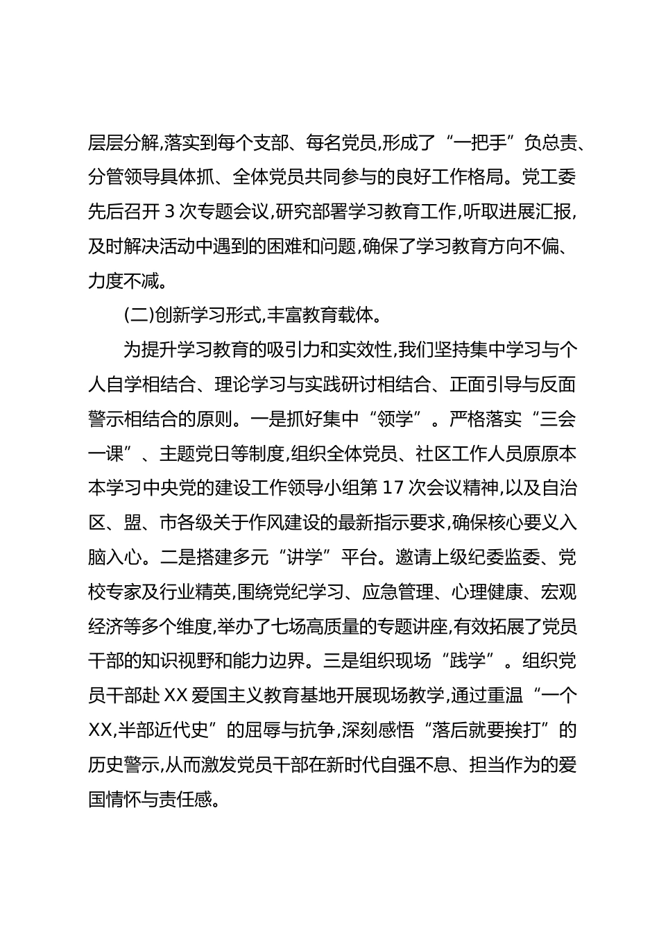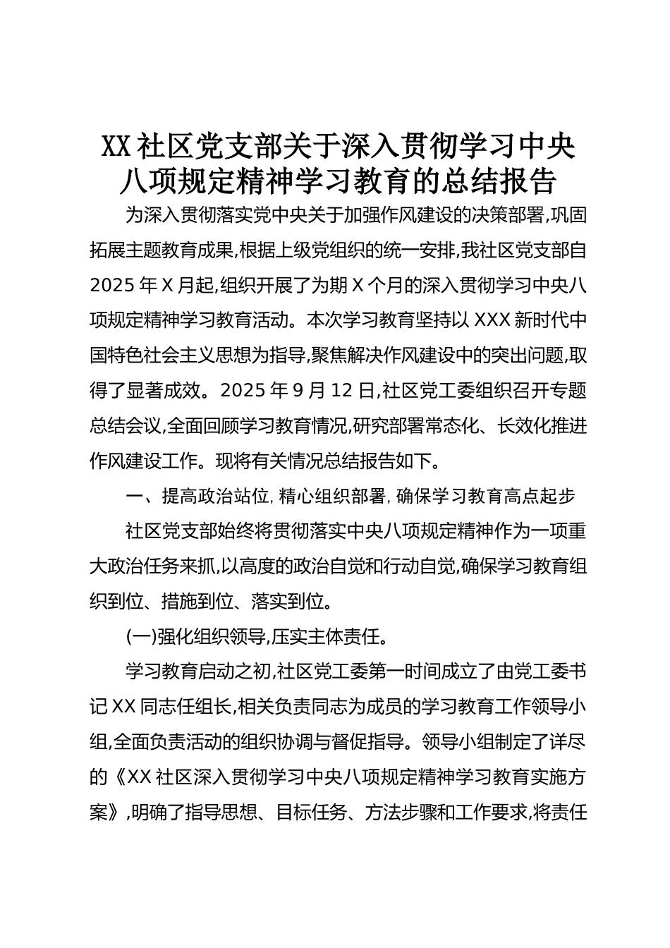 XX社區(qū)黨支部關(guān)于深入貫徹學習中央八項規(guī)定精神學習教育的總結(jié)報告為深入貫徹落實黨中央關(guān)于加強作風建設的決策部署,鞏固拓展主題教育成果,根據(jù)上級黨組織的統(tǒng)一安排,我社區(qū)黨支部自2025年X月起,組織開展了為期X個月的深入貫徹學習中央八項規(guī)定精神學習教育活動。本次學習教育堅持以XXX新時代中國特色社會主義思想為指導,聚焦解決作風建設中的突出問題,取得了顯著成效。2025年9月12日,社區(qū)黨工委組織召開專題總結(jié)會議,全面回顧學習教育情況,研究部署常態(tài)化、長效化推進作風建設工作?,F(xiàn)將有關(guān)情況總結(jié)報告如下。一、提高政治站位,精心組織部署,確保學習教育高點起步社區(qū)...