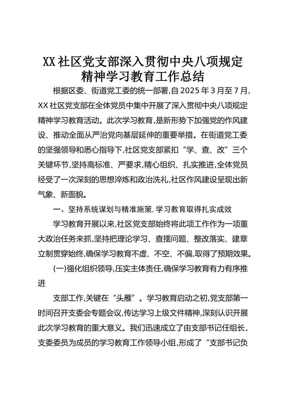XX社區(qū)黨支部深入貫徹中央八項規(guī)定精神學習教育工作總結根據(jù)區(qū)委、街道黨工委的統(tǒng)一部署,自2025年3月至7月,XX社區(qū)黨支部在全體黨員中集中開展了深入貫徹中央八項規(guī)定精神學習教育活動。此次學習教育,是新形勢下加強黨的作風建設、推動全面從嚴治黨向基層延伸的重要舉措。在街道黨工委的堅強領導和悉心指導下,社區(qū)黨支部緊扣“學、查、改”三個關鍵環(huán)節(jié),堅持高標準、嚴要求,精心組織、扎實推進,全體黨員經受了一次深刻的思想淬煉和政治洗禮,社區(qū)作風建設呈現(xiàn)出新氣象、新面貌。一、堅持系統(tǒng)謀劃與精準施策,學習教育取得扎實成效學習教育開展以來,社區(qū)黨支部始終將此項工作...