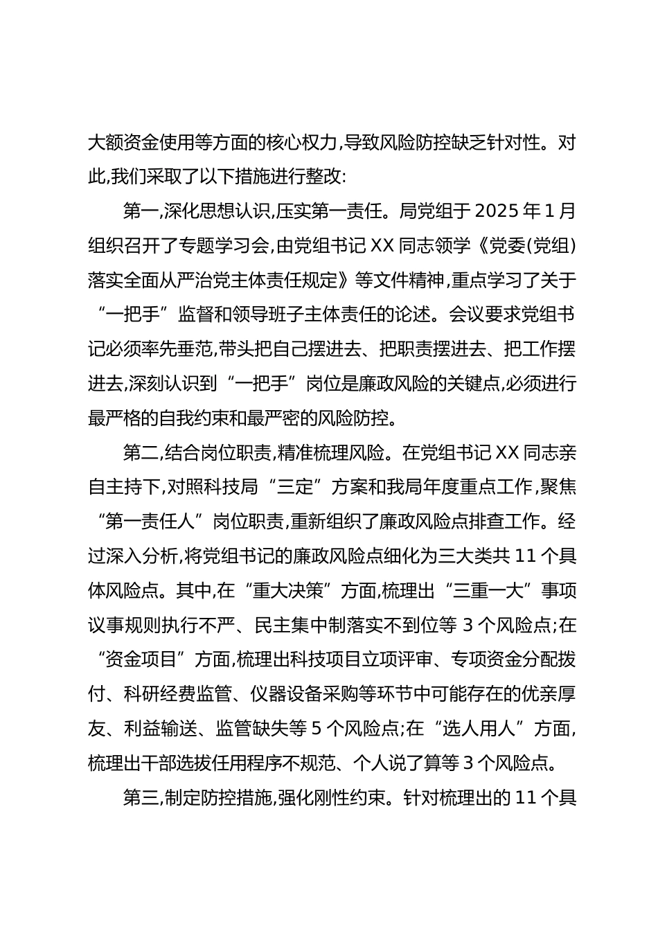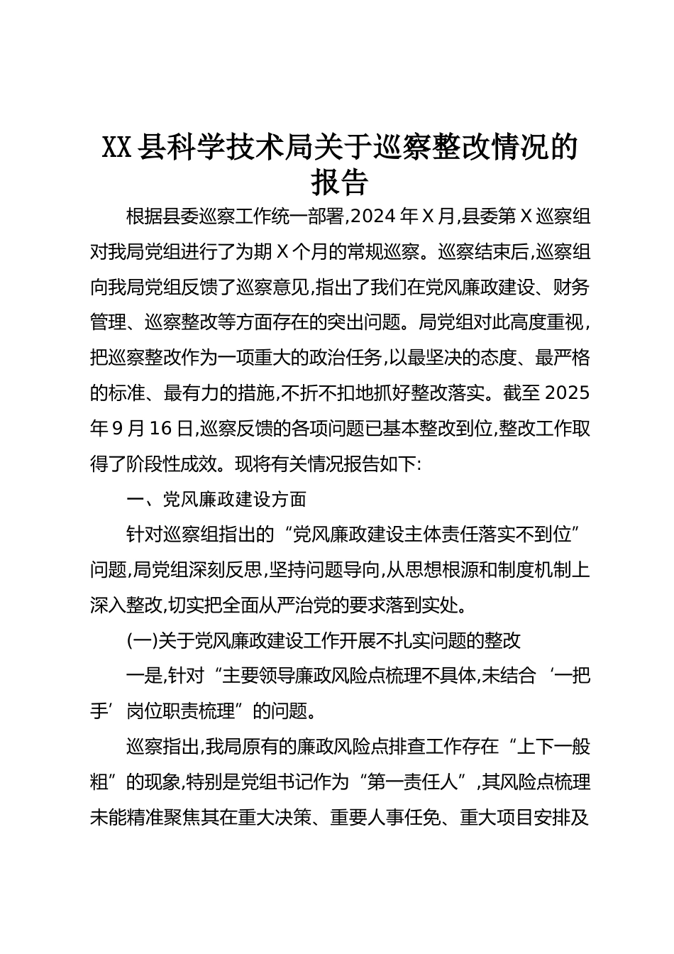 XX縣科學(xué)技術(shù)局關(guān)于巡察整改情況的報(bào)告根據(jù)縣委巡察工作統(tǒng)一部署,2024年X月,縣委第X巡察組對(duì)我局黨組進(jìn)行了為期X個(gè)月的常規(guī)巡察。巡察結(jié)束后,巡察組向我局黨組反饋了巡察意見,指出了我們?cè)邳h風(fēng)廉政建設(shè)、財(cái)務(wù)管理、巡察整改等方面存在的突出問題。局黨組對(duì)此高度重視,把巡察整改作為一項(xiàng)重大的政治任務(wù),以最堅(jiān)決的態(tài)度、最嚴(yán)格的標(biāo)準(zhǔn)、最有力的措施,不折不扣地抓好整改落實(shí)。截至2025年9月16日,巡察反饋的各項(xiàng)問題已基本整改到位,整改工作取得了階段性成效?,F(xiàn)將有關(guān)情況報(bào)告如下:一、黨風(fēng)廉政建設(shè)方面針對(duì)巡察組指出的“黨風(fēng)廉政建設(shè)主體責(zé)任落實(shí)不到位”問題,局黨組深...