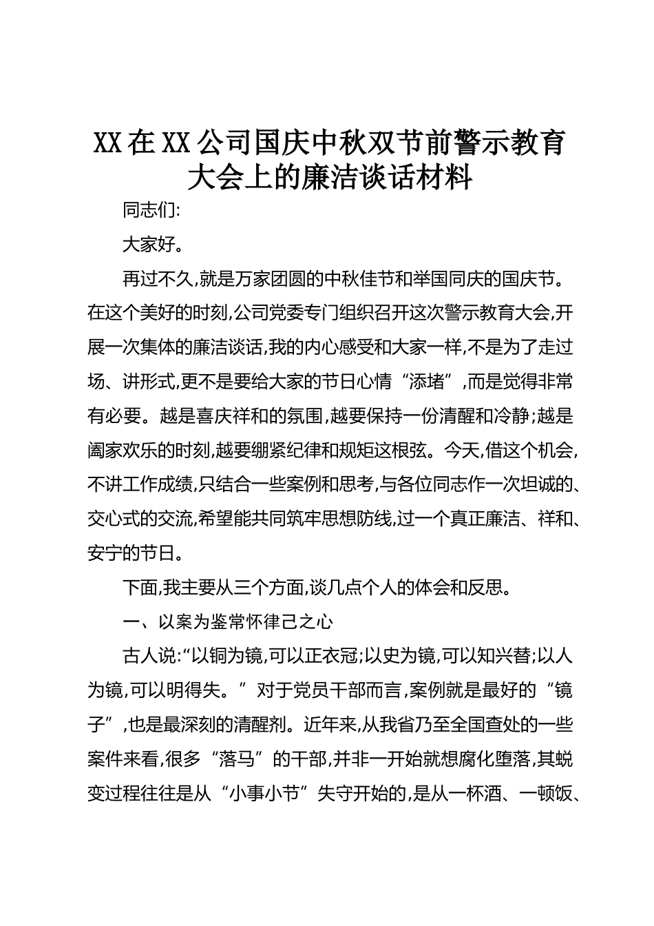 XX在XX公司國慶中秋雙節(jié)前警示教育大會上的廉潔談話材料