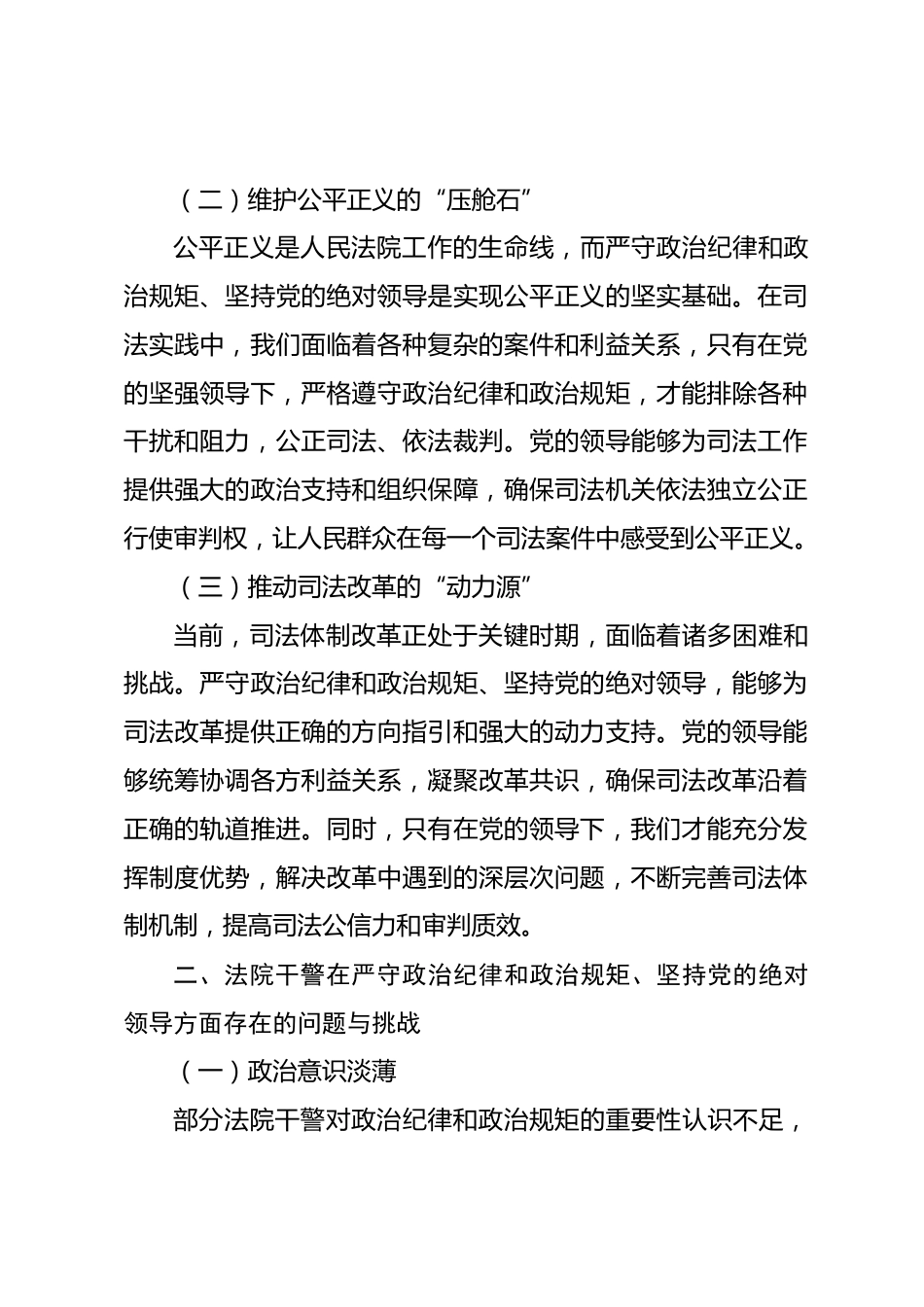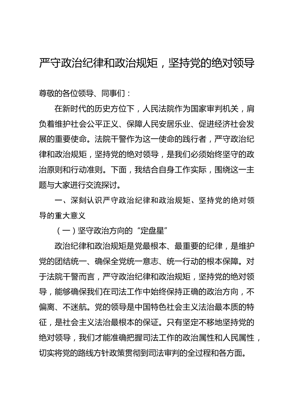 嚴守政治紀律和政治規(guī)矩,堅持黨的絕對領(lǐng)導(dǎo)尊敬的各位領(lǐng)導(dǎo)、同事們:在新時代的歷史方位下,人民法院作為國家審判機關(guān),肩負著維護社會公平正義、保障人民安居樂業(yè)、促進經(jīng)濟社會發(fā)展的重要使命。法院干警作為這一使命的踐行者,嚴守政治紀律和政治規(guī)矩,堅持黨的絕對領(lǐng)導(dǎo),是我們必須始終堅守的政治原則和行動準則。下面,我結(jié)合自身工作實際,圍繞這一主題與大家進行交流探討。一、深刻認識嚴守政治紀律和政治規(guī)矩、堅持黨的絕對領(lǐng)導(dǎo)的重大意義(一)堅守政治方向的“定盤星”政治紀律和政治規(guī)矩是黨最根本、最重要的紀律,是維護黨的團結(jié)統(tǒng)一、確保全黨統(tǒng)一意志、統(tǒng)一...