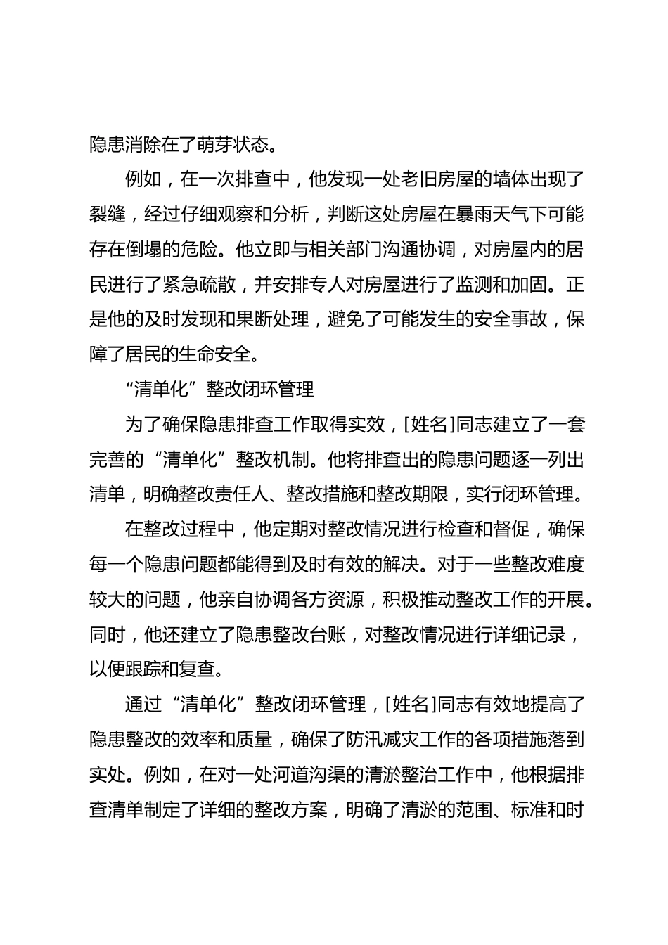 個(gè)人防汛減災(zāi)工作先進(jìn)事跡推薦申報(bào)材料在防汛減災(zāi)這場(chǎng)沒有硝煙的戰(zhàn)場(chǎng)上,總有一些人挺身而出以高度的責(zé)任感、過硬的作風(fēng)和真摯的情懷,守護(hù)著人民群眾的生命財(cái)產(chǎn)安全。[姓名]同志便是這樣一位在防汛減災(zāi)工作中表現(xiàn)卓越的先進(jìn)典范,他以實(shí)際行動(dòng)詮釋了一名基層工作者的使命與擔(dān)當(dāng)。隱患排查“細(xì)如織網(wǎng)”,以“時(shí)時(shí)放心不下”的責(zé)任感守牢防線“拉網(wǎng)式”排查抓早抓小[姓名]同志深知,防汛減災(zāi)工作重在預(yù)防,隱患排查是首要環(huán)節(jié)。每到汛期來臨之前,他便帶領(lǐng)團(tuán)隊(duì)對(duì)轄區(qū)內(nèi)的各類防汛隱患點(diǎn)進(jìn)行全面深入的“拉網(wǎng)式”排查。無論是老舊房屋、低洼地帶,還是河道溝渠、水庫堤壩,...