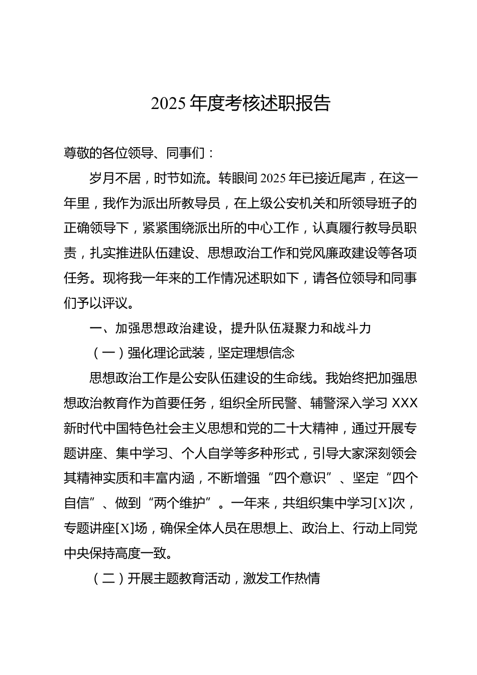 2025年度考核述職報(bào)告尊敬的各位領(lǐng)導(dǎo)、同事們:歲月不居,時(shí)節(jié)如流。轉(zhuǎn)眼間2025年已接近尾聲,在這一年里,我作為派出所教導(dǎo)員,在上級公安機(jī)關(guān)和所領(lǐng)導(dǎo)班子的正確領(lǐng)導(dǎo)下,緊緊圍繞派出所的中心工作,認(rèn)真履行教導(dǎo)員職責(zé),扎實(shí)推進(jìn)隊(duì)伍建設(shè)、思想政治工作和黨風(fēng)廉政建設(shè)等各項(xiàng)任務(wù)?,F(xiàn)將我一年來的工作情況述職如下,請各位領(lǐng)導(dǎo)和同事們予以評議。一、加強(qiáng)思想政治建設(shè),提升隊(duì)伍凝聚力和戰(zhàn)斗力(一)強(qiáng)化理論武裝,堅(jiān)定理想信念思想政治工作是公安隊(duì)伍建設(shè)的生命線。我始終把加強(qiáng)思想政治教育作為首要任務(wù),組織全所民警、輔警深入學(xué)習(xí)XXX新時(shí)代中國特色社會(huì)主義思想和...