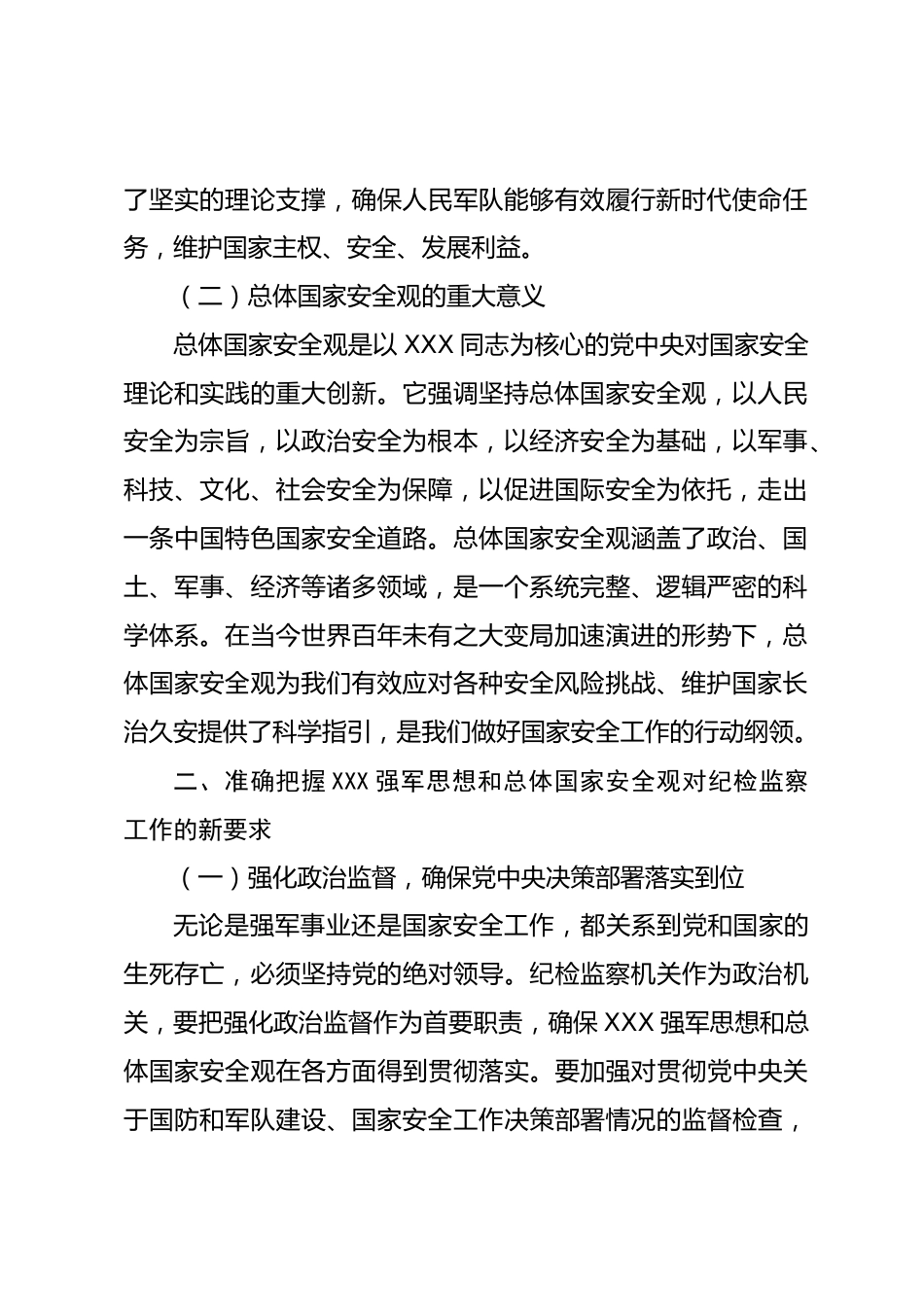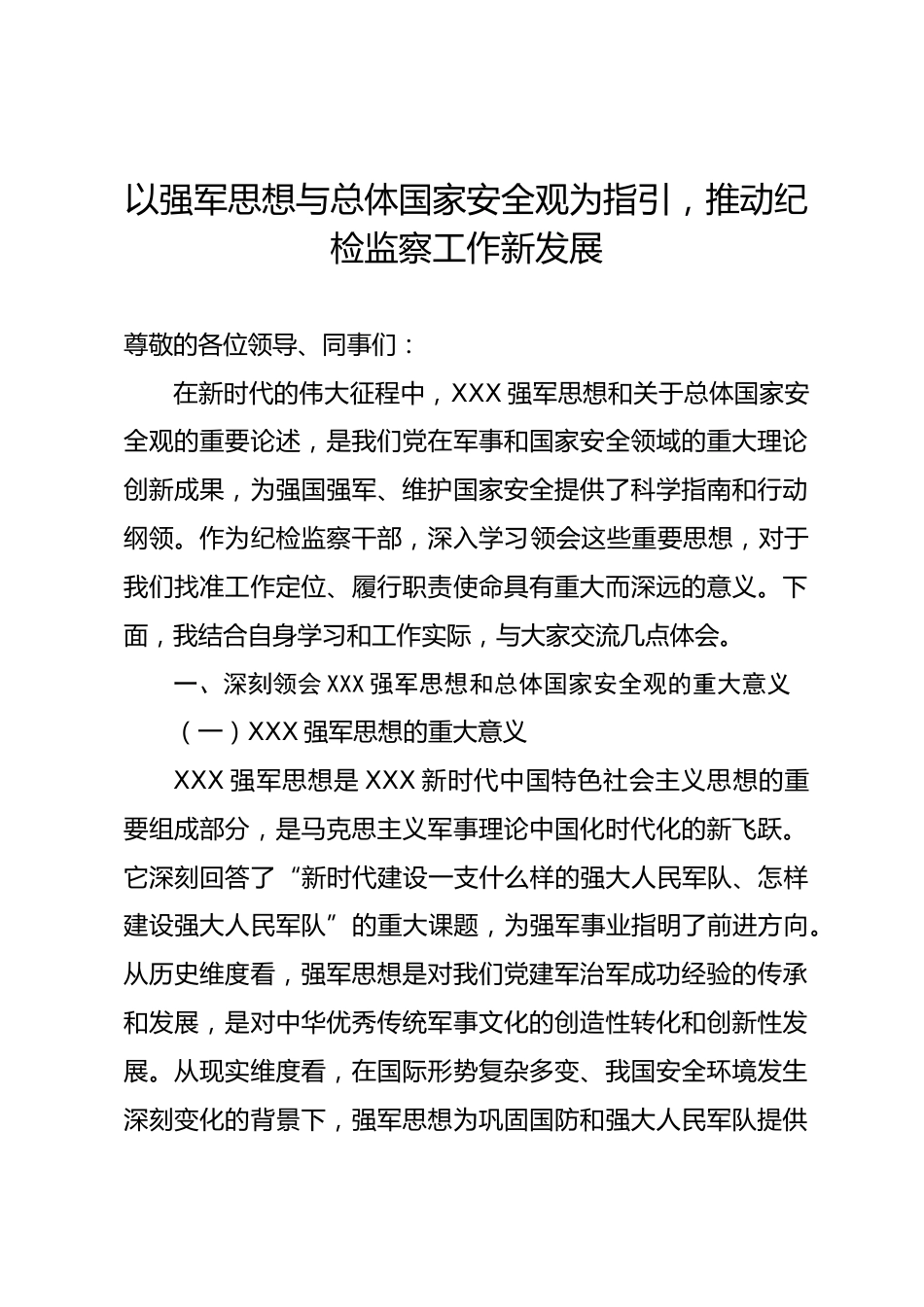 以強(qiáng)軍思想與總體國(guó)家安全觀為指引,推動(dòng)紀(jì)檢監(jiān)察工作新發(fā)展尊敬的各位領(lǐng)導(dǎo)、同事們:在新時(shí)代的偉大征程中,XXX強(qiáng)軍思想和關(guān)于總體國(guó)家安全觀的重要論述,是我們黨在軍事和國(guó)家安全領(lǐng)域的重大理論創(chuàng)新成果,為強(qiáng)國(guó)強(qiáng)軍、維護(hù)國(guó)家安全提供了科學(xué)指南和行動(dòng)綱領(lǐng)。作為紀(jì)檢監(jiān)察干部,深入學(xué)習(xí)領(lǐng)會(huì)這些重要思想,對(duì)于我們找準(zhǔn)工作定位、履行職責(zé)使命具有重大而深遠(yuǎn)的意義。下面,我結(jié)合自身學(xué)習(xí)和工作實(shí)際,與大家交流幾點(diǎn)體會(huì)。一、深刻領(lǐng)會(huì)XXX強(qiáng)軍思想和總體國(guó)家安全觀的重大意義(一)XXX強(qiáng)軍思想的重大意義XXX強(qiáng)軍思想是XXX新時(shí)代中國(guó)特色社會(huì)主義思想的重要組成部分,...