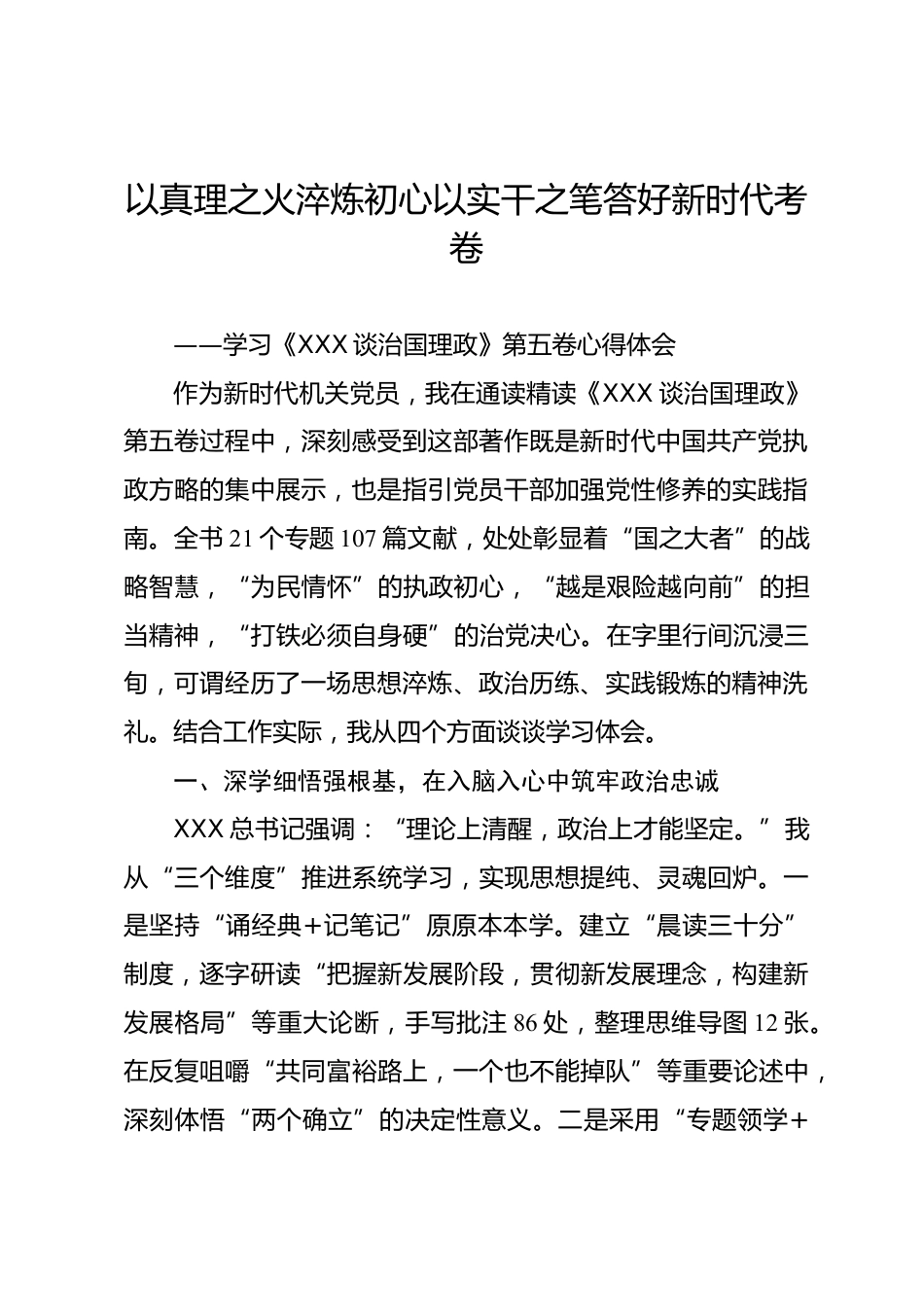 以真理之火淬煉初心以實(shí)干之筆答好新時(shí)代考卷——學(xué)習(xí)《XXX談治國(guó)理政》第五卷心得體會(huì)作為新時(shí)代機(jī)關(guān)黨員,我在通讀精讀《XXX談治國(guó)理政》第五卷過(guò)程中,深刻感受到這部著作既是新時(shí)代中國(guó)共產(chǎn)黨執(zhí)政方略的集中展示,也是指引黨員干部加強(qiáng)黨性修養(yǎng)的實(shí)踐指南。全書21個(gè)專題107篇文獻(xiàn),處處彰顯著“國(guó)之大者”的戰(zhàn)略智慧,“為民情懷”的執(zhí)政初心,“越是艱險(xiǎn)越向前”的擔(dān)當(dāng)精神,“打鐵必須自身硬”的治黨決心。在字里行間沉浸三旬,可謂經(jīng)歷了一場(chǎng)思想淬煉、政治歷練、實(shí)踐鍛煉的精神洗禮。結(jié)合工作實(shí)際,我從四個(gè)方面談?wù)剬W(xué)習(xí)體會(huì)。一、深學(xué)細(xì)悟強(qiáng)根基,在入腦入心中...