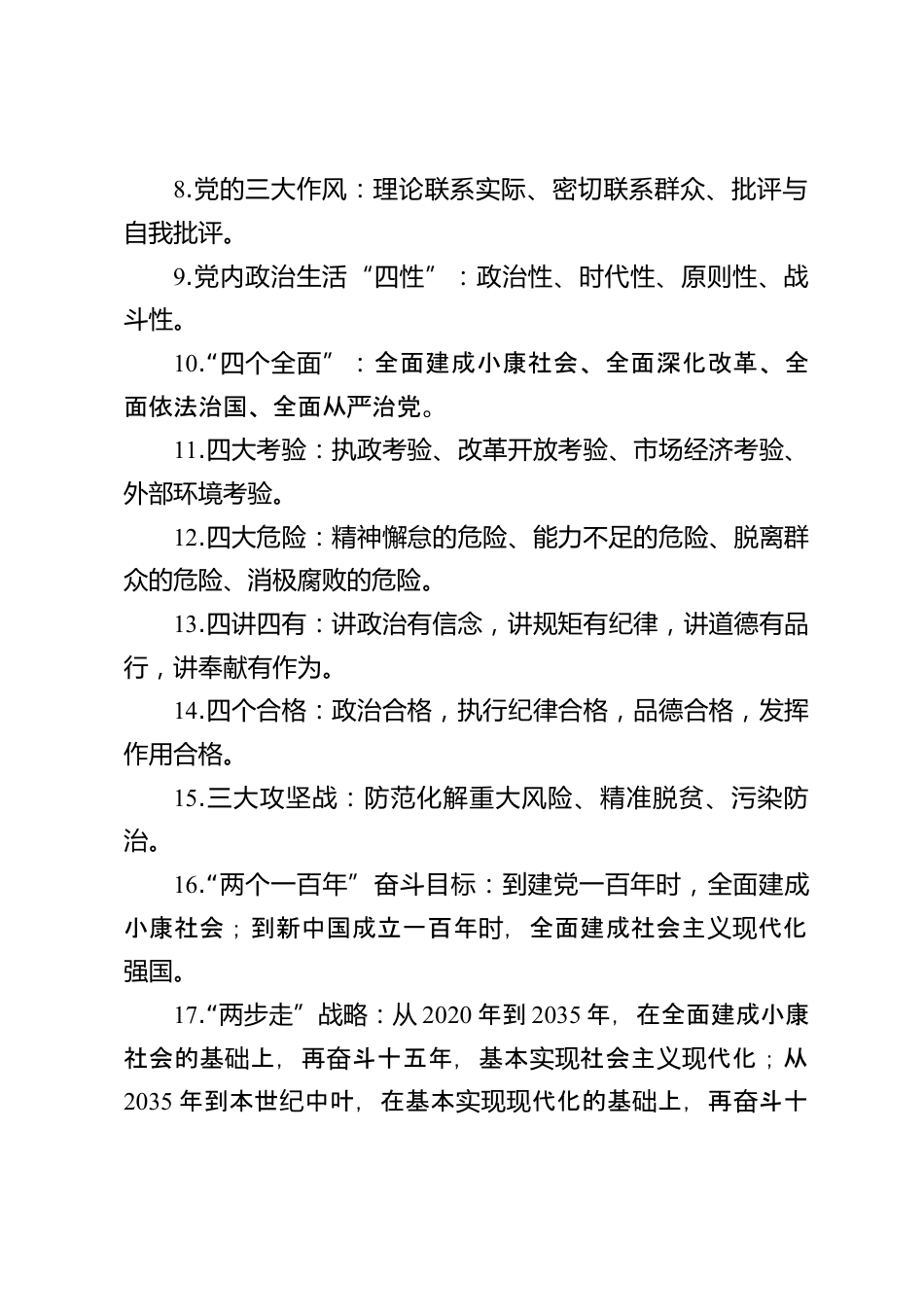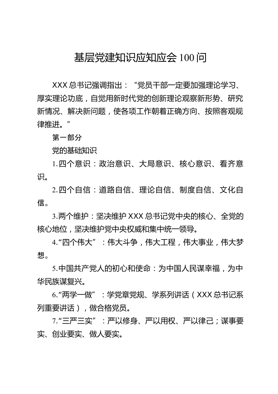 基層黨建知識應(yīng)知應(yīng)會100問XXX總書記強調(diào)指出:“黨員干部一定要加強理論學(xué)習(xí)、厚實理論功底,自覺用新時代黨的創(chuàng)新理論觀察新形勢、研究新情況、解決新問題,使各項工作朝著正確方向、按照客觀規(guī)律推進?!钡谝徊糠贮h的基礎(chǔ)知識1.四個意識:政治意識、大局意識、核心意識、看齊意識。2.四個自信:道路自信、理論自信、制度自信、文化自信。3.兩個維護:堅決維護XXX總書記黨中央的核心、全黨的核心地位,堅決維護黨中央權(quán)威和集中統(tǒng)一領(lǐng)導(dǎo)。4.“四個偉大”:偉大斗爭,偉大工程,偉大事業(yè),偉大夢想。5.中國共產(chǎn)黨人的初心和使命:為中國人民謀幸福,為中華民族謀復(fù)興。6...