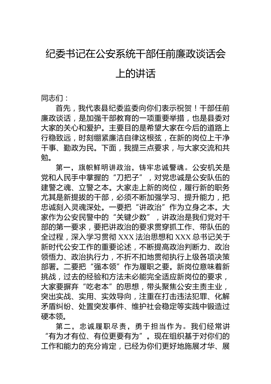 紀(jì)委書記在公安系統(tǒng)干部任前廉政談話會上的講話同志們:首先,我代表縣紀(jì)委監(jiān)委向你們表示祝賀!干部任前廉政談話,是加強干部教育的一項重要舉措,也是縣委對大家的關(guān)心和愛護(hù)。主要目的是希望大家在今后的道路上行穩(wěn)致遠(yuǎn),時刻繃緊廉潔自律這根弦,在新的崗位上干凈干事、勤政為民。下面,我提三點要求,與大家交流和共勉。第一,旗幟鮮明講政治,鑄牢忠誠警魂。公安機關(guān)是黨和人民手中掌握的“刀把子”,對黨忠誠是公安隊伍的建警之魂、立警之本。大家走上新的崗位,履行新的職務(wù)尤其是新提拔的干部,必須不斷加強學(xué)習(xí)、提升能力,把忠誠刻入靈魂深處。一要把“講政治...