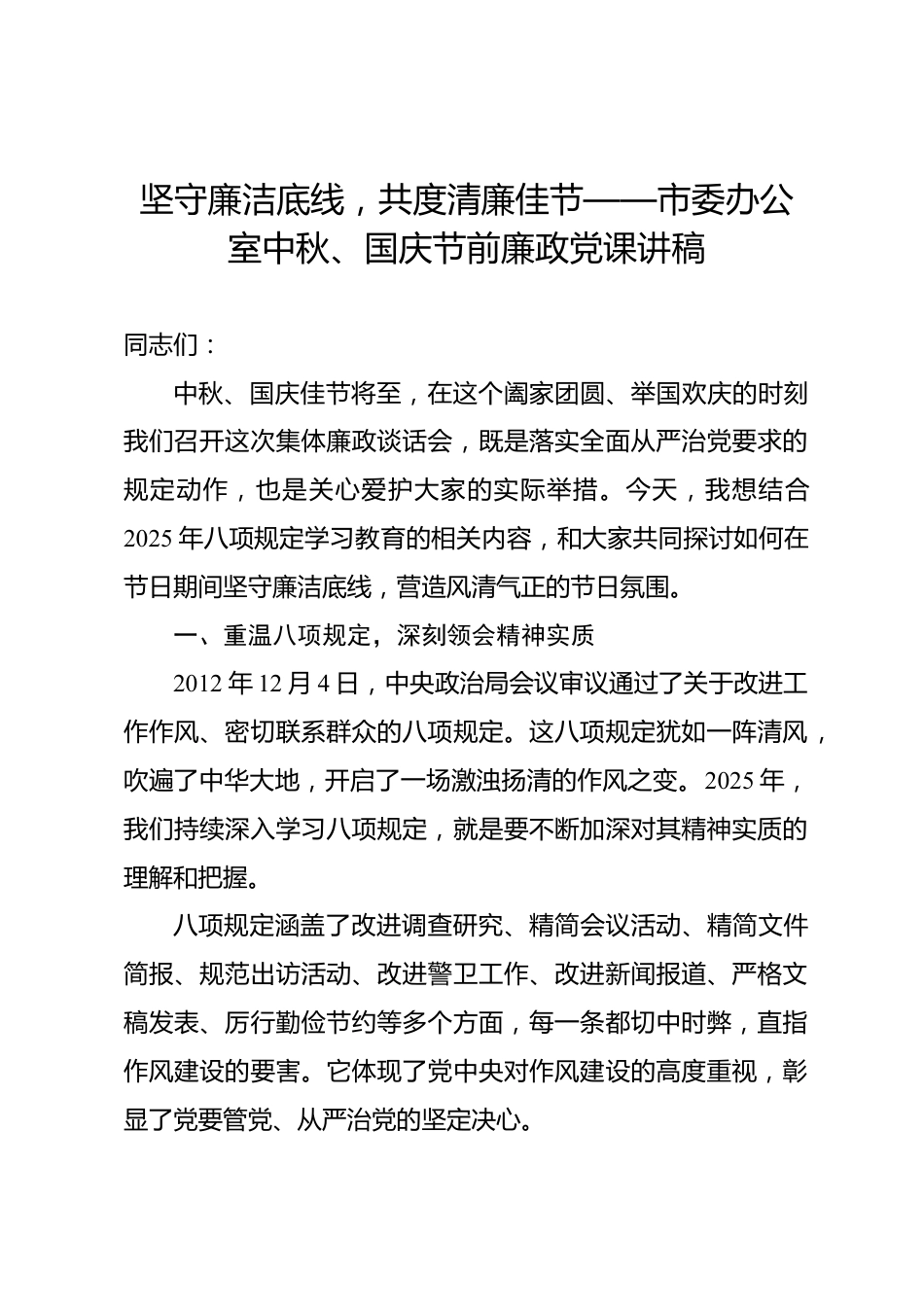 堅守廉潔底線,共度清廉佳節(jié)——市委辦公室中秋、國慶節(jié)前廉政黨課講稿同志們:中秋、國慶佳節(jié)將至,在這個闔家團圓、舉國歡慶的時刻我們召開這次集體廉政談話會,既是落實全面從嚴治黨要求的規(guī)定動作,也是關(guān)心愛護大家的實際舉措。今天,我想結(jié)合2025年八項規(guī)定學習教育的相關(guān)內(nèi)容,和大家共同探討如何在節(jié)日期間堅守廉潔底線,營造風清氣正的節(jié)日氛圍。一、重溫八項規(guī)定,深刻領會精神實質(zhì)2012年12月4日,中央政治局會議審議通過了關(guān)于改進工作作風、密切聯(lián)系群眾的八項規(guī)定。這八項規(guī)定猶如一陣清風,吹遍了中華大地,開啟了一場激濁揚清的作風之變。2025年,我們持...