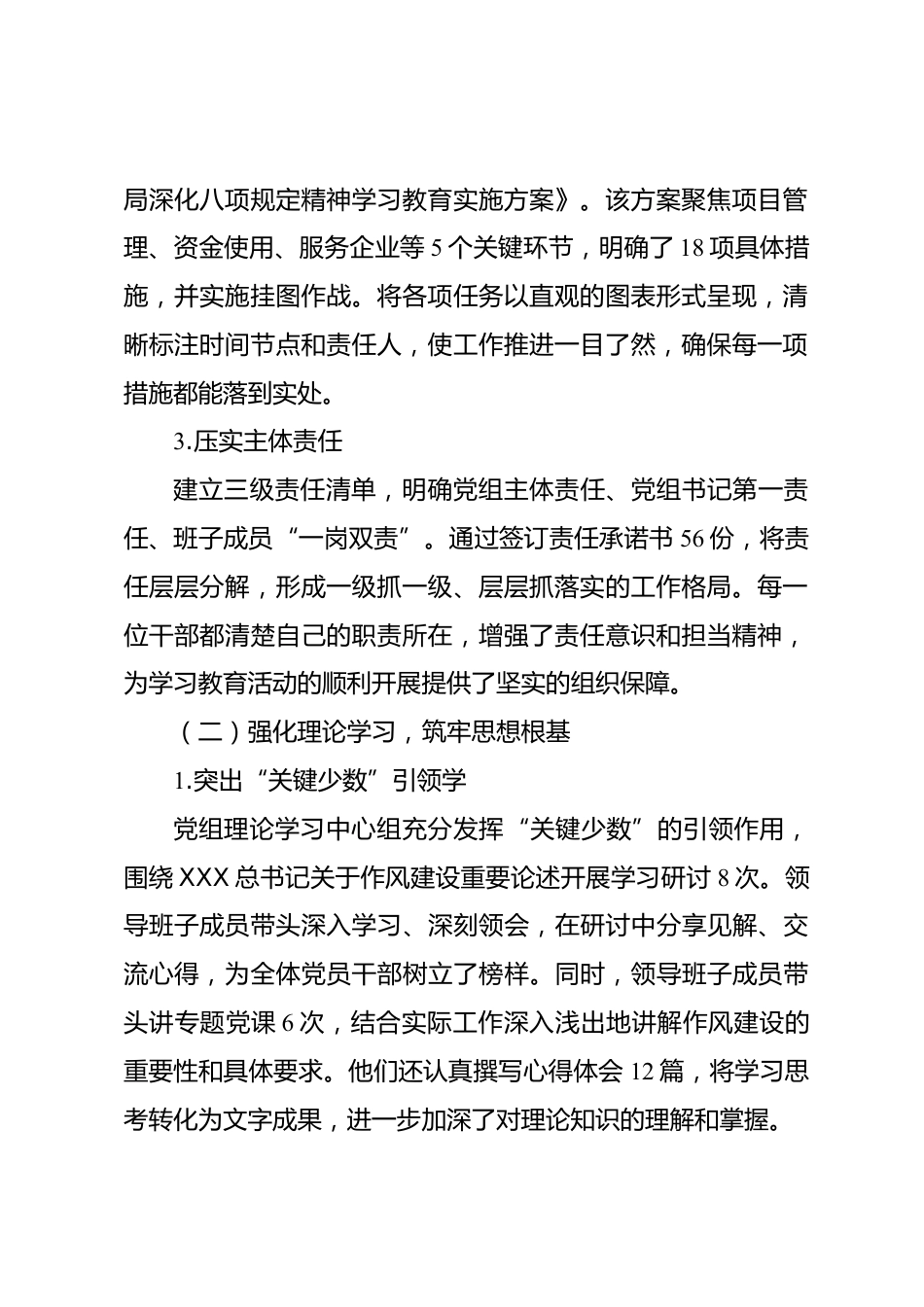 區(qū)科技局2025年深入貫徹八項(xiàng)規(guī)定精神學(xué)習(xí)教育總結(jié)報(bào)告2025年,在區(qū)委、區(qū)政府的正確領(lǐng)導(dǎo)下,區(qū)科技局以高度的政治責(zé)任感和使命感,深入貫徹落實(shí)中央八項(xiàng)規(guī)定精神。緊密圍繞科技創(chuàng)新工作實(shí)際,精心謀劃、扎實(shí)推進(jìn)學(xué)習(xí)教育活動,取得了顯著成效?,F(xiàn)將工作情況總結(jié)如下:一、主要做法(一)強(qiáng)化組織領(lǐng)導(dǎo),制定詳細(xì)方案1.健全工作機(jī)制為確保學(xué)習(xí)教育活動有序開展,區(qū)科技局成立了以黨組書記為組長的專項(xiàng)工作領(lǐng)導(dǎo)小組。領(lǐng)導(dǎo)小組下設(shè)辦公室和3個工作專班,分工明確、協(xié)同作戰(zhàn)。建立“周例會、月總結(jié)、季評估”工作機(jī)制,每周通過例會及時溝通工作進(jìn)展、解決問題;每月進(jìn)行全面...