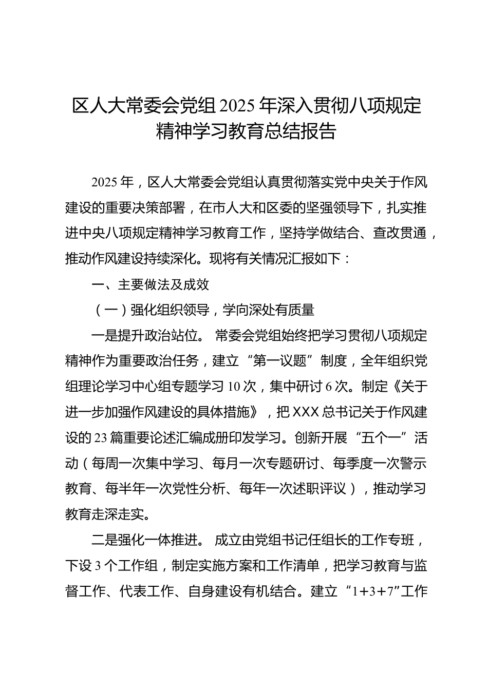 區(qū)人大常委會(huì)黨組2025年深入貫徹八項(xiàng)規(guī)定精神學(xué)習(xí)教育總結(jié)報(bào)告