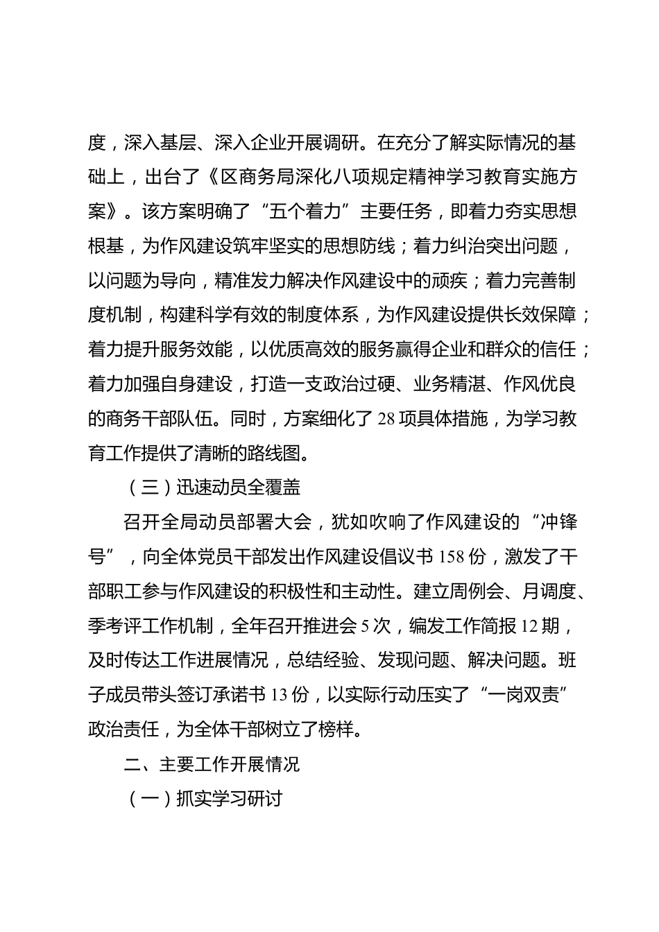 區(qū)商務(wù)局領(lǐng)導(dǎo)班子2025年貫徹落實(shí)中央八項(xiàng)規(guī)定精神學(xué)習(xí)教育總結(jié)報(bào)告2025年,在區(qū)委區(qū)政府的堅(jiān)強(qiáng)領(lǐng)導(dǎo)下,區(qū)商務(wù)局領(lǐng)導(dǎo)班子高舉XXX新時(shí)代中國特色社會(huì)主義思想偉大旗幟,深入貫徹落實(shí)黨的二十大關(guān)于作風(fēng)建設(shè)的新要求。緊緊圍繞商務(wù)高質(zhì)量發(fā)展目標(biāo)任務(wù),以高度的政治責(zé)任感和使命感,扎實(shí)推進(jìn)中央八項(xiàng)規(guī)定精神學(xué)習(xí)教育工作,取得了顯著實(shí)效。現(xiàn)將有關(guān)情況詳細(xì)報(bào)告如下:一、啟動(dòng)部署(一)高位推動(dòng)強(qiáng)引領(lǐng)局黨組深刻認(rèn)識(shí)到貫徹落實(shí)中央八項(xiàng)規(guī)定精神的重要性和緊迫性,將學(xué)習(xí)教育列入年度重點(diǎn)工作,擺在突出位置。成立了以黨組書記、局長任組長的專項(xiàng)工作領(lǐng)導(dǎo)小組,猶如堅(jiān)強(qiáng)的...