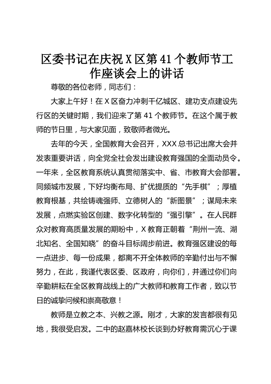 區(qū)委書記在慶祝X區(qū)第41個(gè)教師節(jié)工作座談會(huì)上的講話