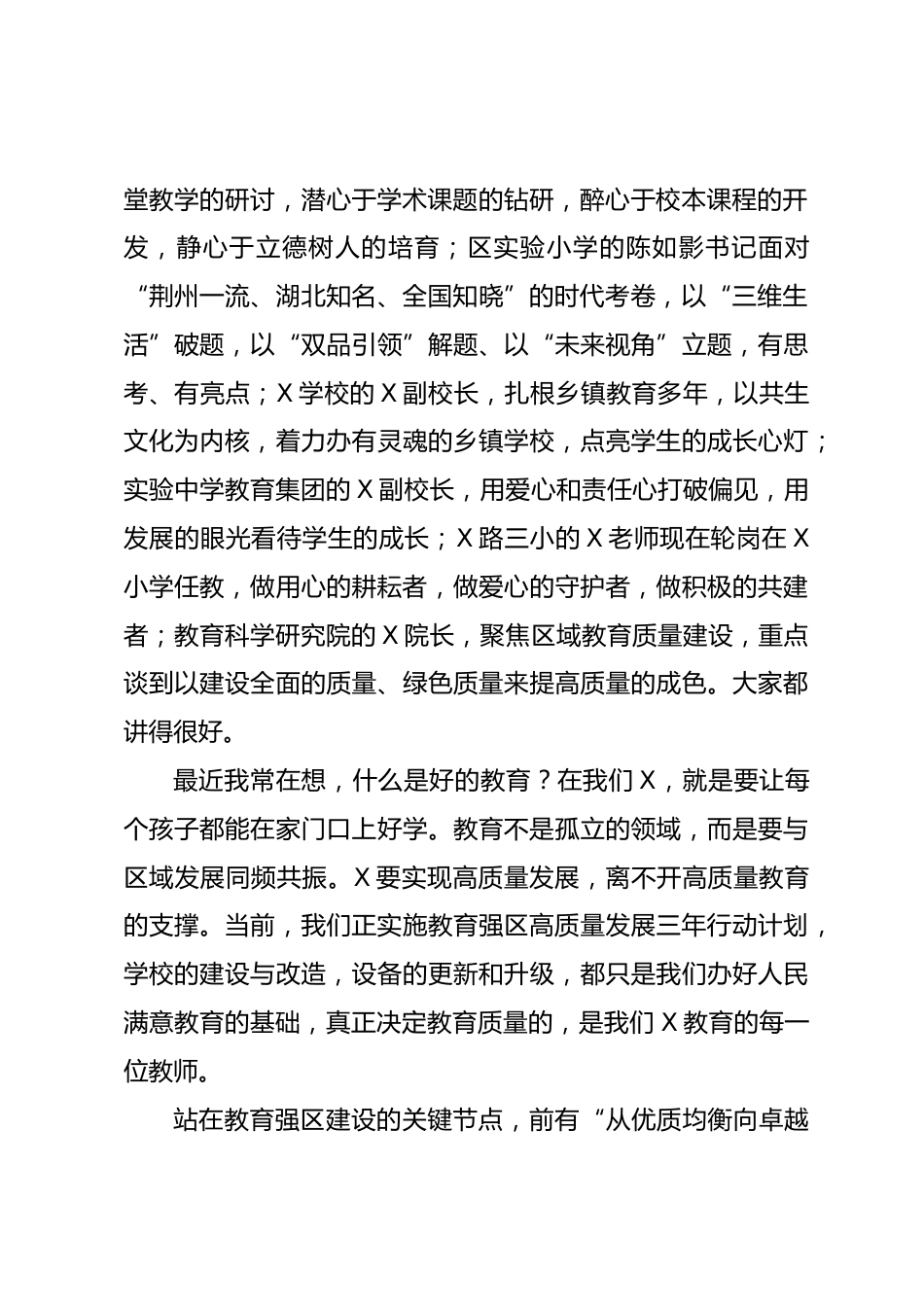 區(qū)委書記在慶祝X區(qū)第41個(gè)教師節(jié)工作座談會(huì)上的講話尊敬的各位老師,同志們:大家上午好!在X區(qū)奮力沖刺千億城區(qū)、建功支點(diǎn)建設(shè)先行區(qū)的關(guān)鍵時(shí)期,我們迎來(lái)了第41個(gè)教師節(jié)。在這個(gè)屬于教師的節(jié)日里,與大家見(jiàn)面,致敬師者微光。去年的今天,全國(guó)教育大會(huì)召開(kāi),XXX總書記出席大會(huì)并發(fā)表重要講話,向全黨全社會(huì)發(fā)出建設(shè)教育強(qiáng)國(guó)的全面動(dòng)員令。一年來(lái),全區(qū)教育系統(tǒng)認(rèn)真貫徹落實(shí)中、省、市教育大會(huì)部署。同頻城市發(fā)展,下好均衡布局、擴(kuò)優(yōu)提質(zhì)的“先手棋”;厚植教育根基,共繪鑄魂強(qiáng)師、立德樹人的“新圖景”;謀局未來(lái)發(fā)展,點(diǎn)燃實(shí)驗(yàn)區(qū)創(chuàng)建、數(shù)字化轉(zhuǎn)型的“強(qiáng)引擎”。在人...
