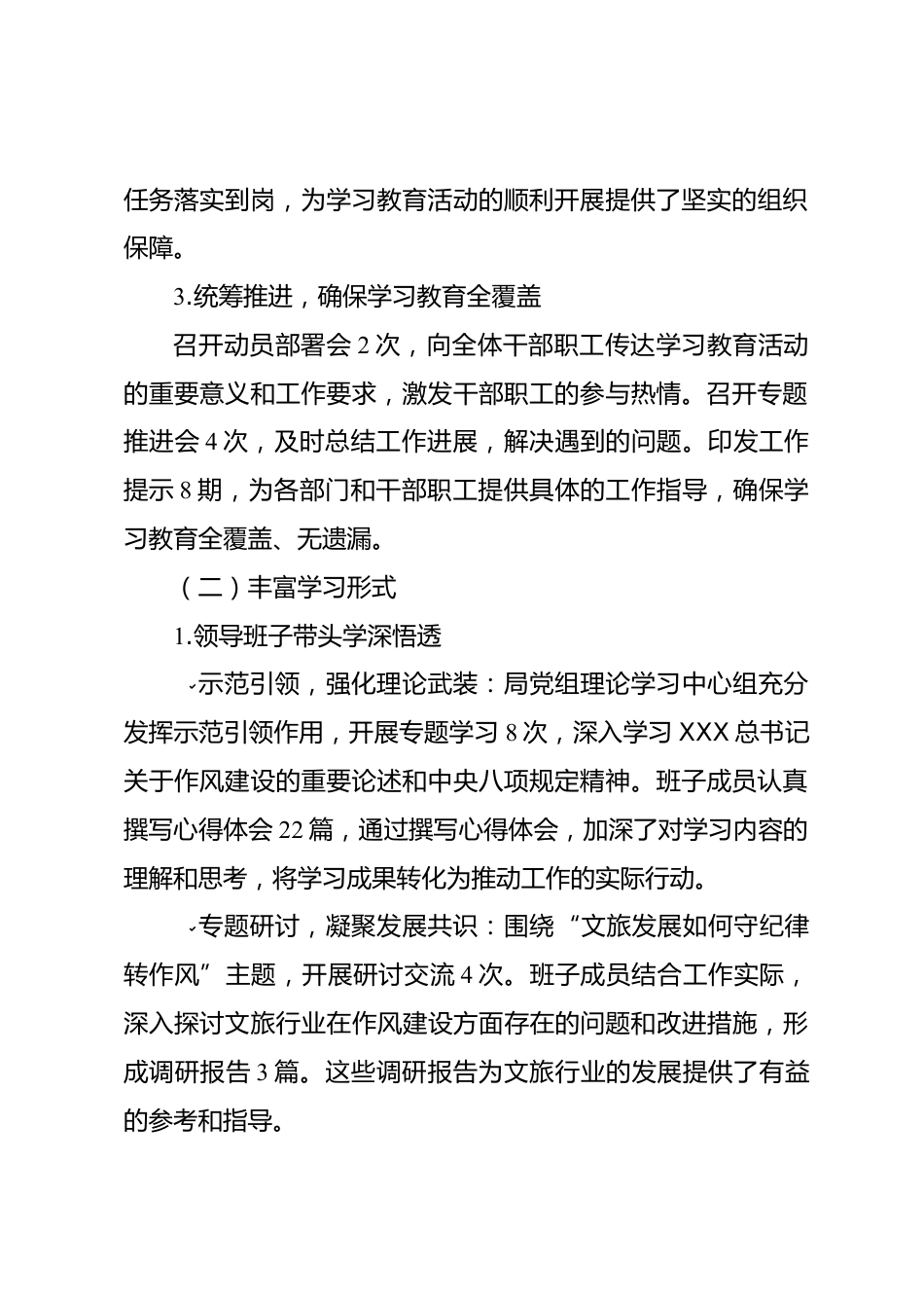 區(qū)文廣旅局2025年開展深入貫徹中央八項(xiàng)規(guī)定精神學(xué)習(xí)教育工作總結(jié)報(bào)告2025年,區(qū)文廣旅局以XXX新時(shí)代中國(guó)特色社會(huì)主義思想為指引,深入貫徹落實(shí)中央八項(xiàng)規(guī)定精神。緊密圍繞文旅工作實(shí)際,精心謀劃、扎實(shí)推進(jìn)學(xué)習(xí)教育工作,使其走深走實(shí),取得了顯著成效?,F(xiàn)將工作開展情況詳細(xì)總結(jié)如下:一、學(xué)習(xí)教育開展情況(一)精心組織部署1.高位推動(dòng),構(gòu)建有力組織架構(gòu)區(qū)文廣旅局高度重視此次學(xué)習(xí)教育活動(dòng),成立了以黨組書記、局長(zhǎng)任組長(zhǎng)的專項(xiàng)工作領(lǐng)導(dǎo)小組。領(lǐng)導(dǎo)小組下設(shè)學(xué)習(xí)教育、問題查擺、整改落實(shí)3個(gè)工作專班,分工明確、職責(zé)清晰。同時(shí),制定了《區(qū)文廣旅局深化八項(xiàng)規(guī)定精神學(xué)...